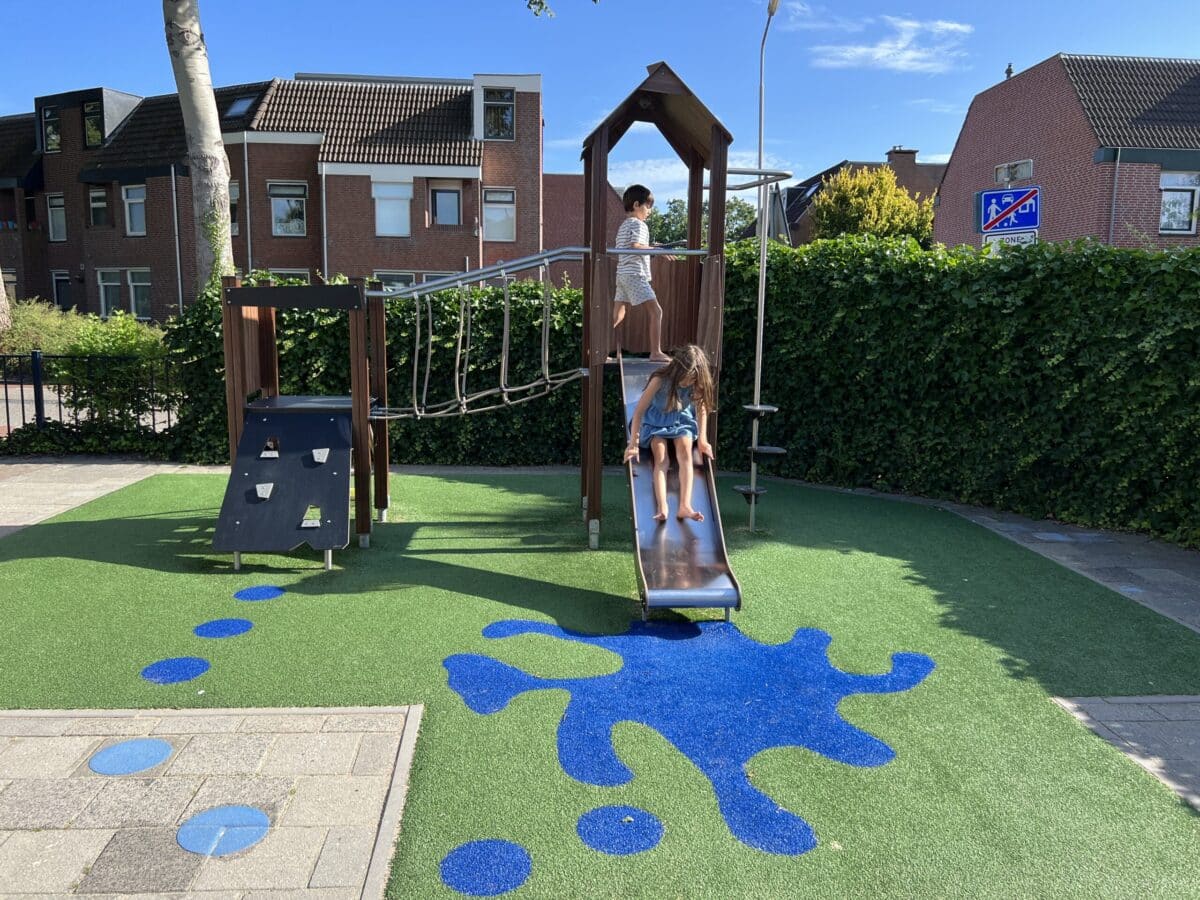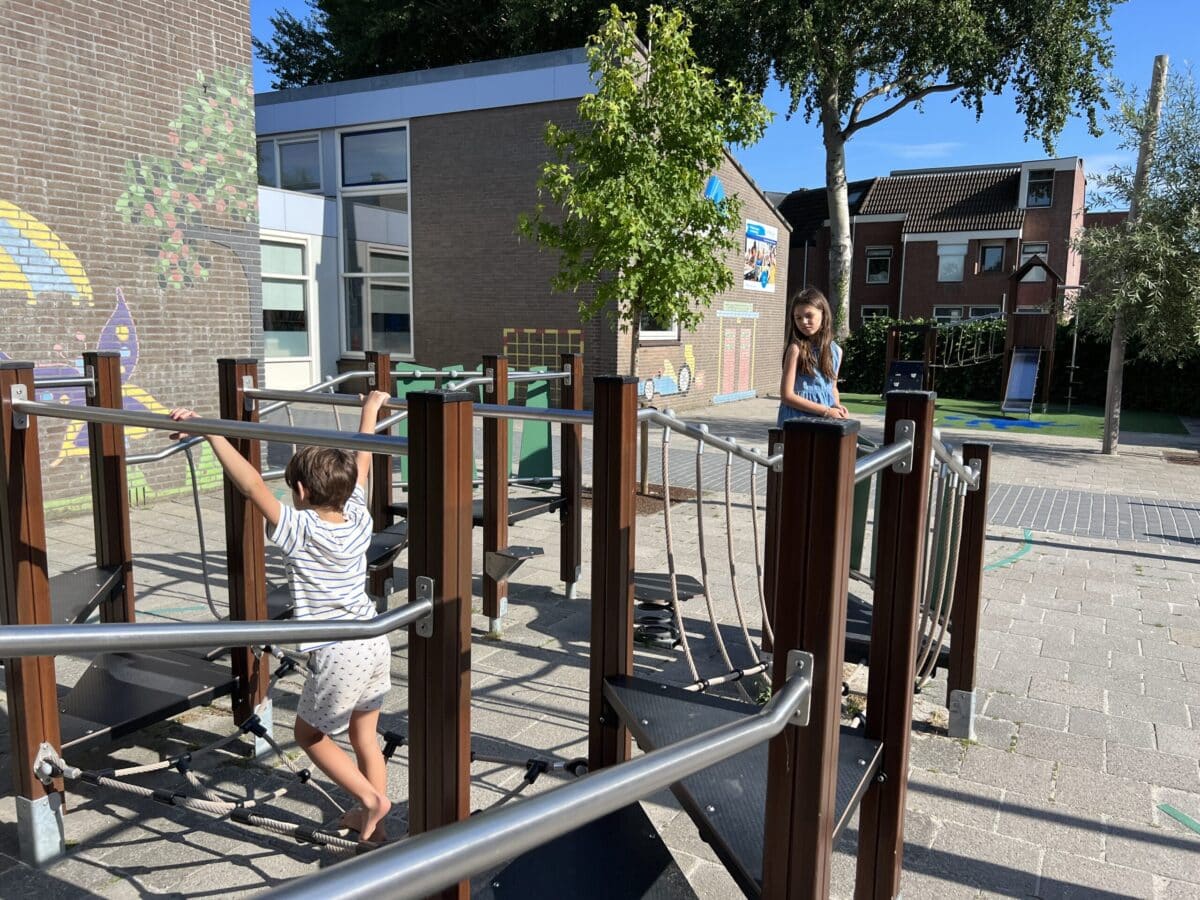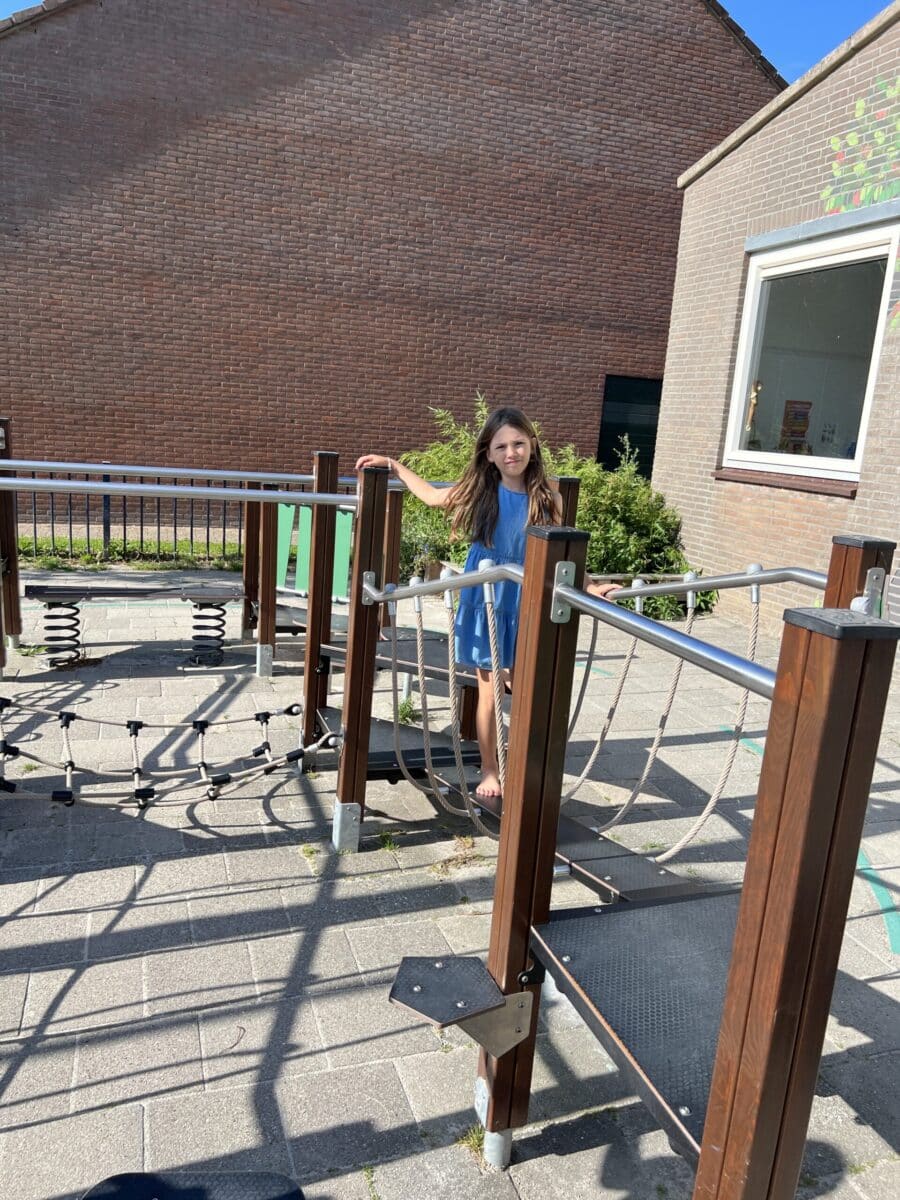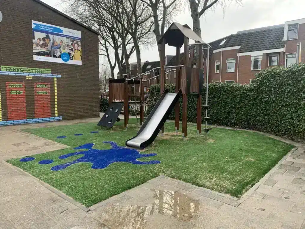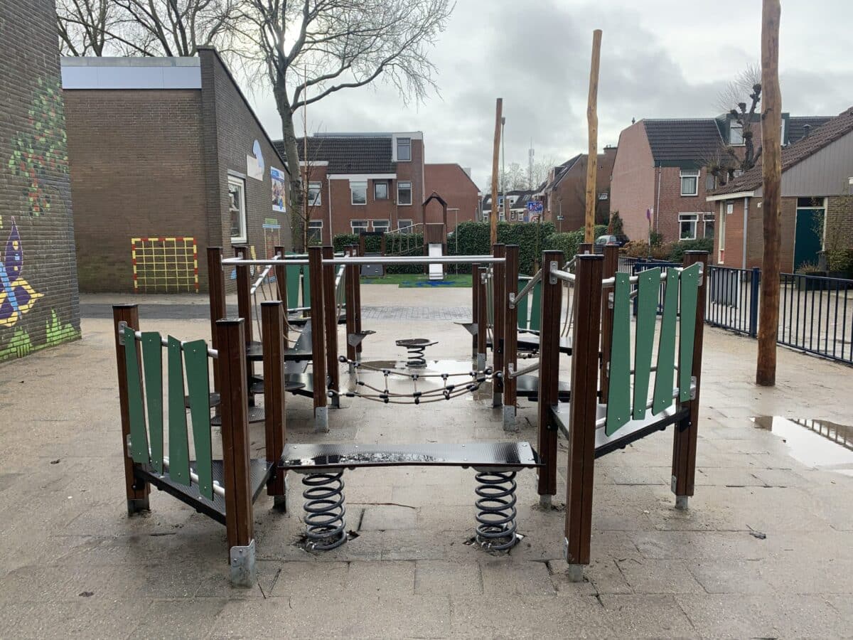 Na bijna 20 jaar was het schoolplein van BS Driespan toe aan een nieuwe inrichting. Opnieuw mochten wij dit voor de school doen. Voor het zover was is eerst door Vreeker Bestrating & Groen uit Hem het voorwerk gedaan, de (te) grote bomen zijn weggehaald, bestrating aangepast en opnieuw gelegd, plantvakken gemaakt en een aantal nieuwe bomen geplaatst. Daarna zijn de speeltoestellen geplaatst. Op het onderbouwplein zijn een Evenwichtparcours WD1461 in een mosgroene uitvoering en speeltoestel Wooden WD1408 in houtprint uitstraling geplaatst. Bij dit klimtoestel is een valdempende kunstgras ondergrond aangelegd waarin een aantal blauwe figuren zijn aangebracht. Ook zijn gelijktijdig een drietal 5 meter hoge Robinia palen in het plein geplaatst. Hier worden in de zomermaanden een aantal schaduwdoeken aan opgehangen. Het bovenbouwplein heeft een groot nieuwe klim-klautercombinatie WD1452 gekregen, een duikelrek WD1428, de supergave Spinnerbowl HP0710 ,een drievoudige evenwichtbalken set RB1257 en de vrolijke inktvisballenvanger SL0809. Valdempend kunstgras zorgt voor een veilige ondergrond waar nodig.