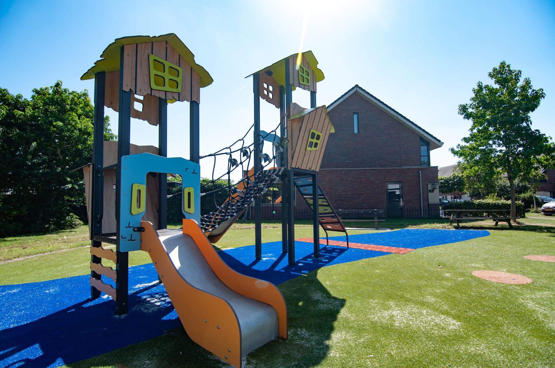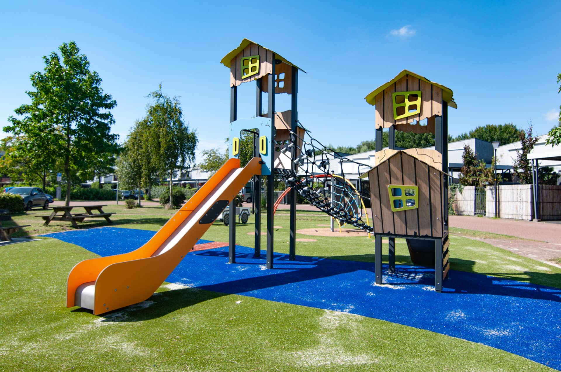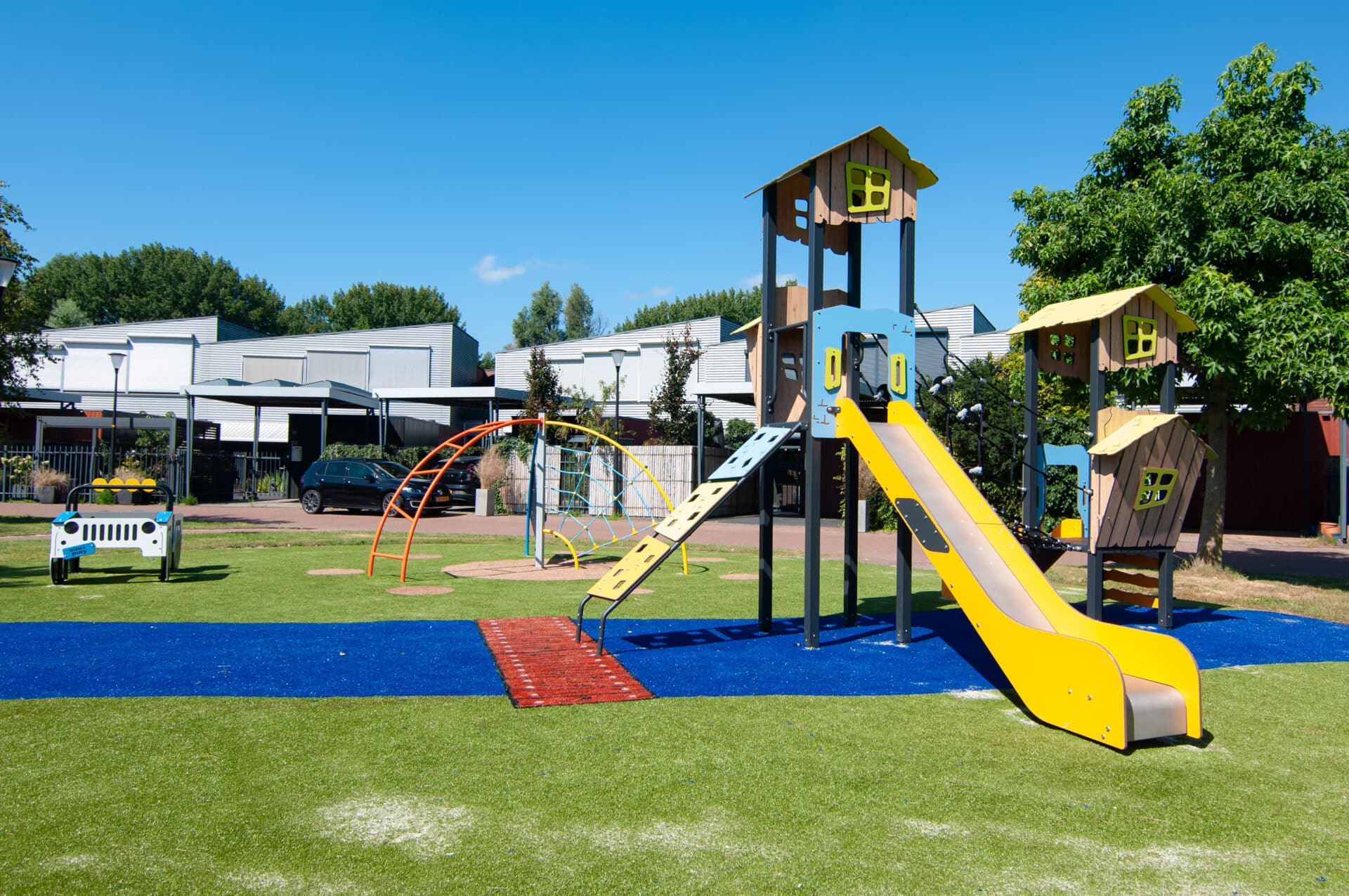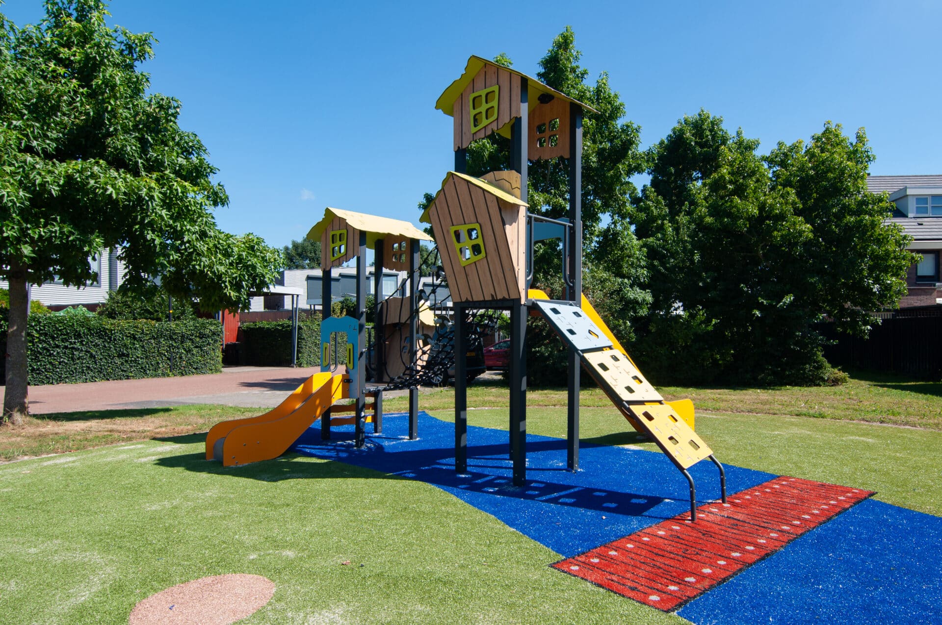 Kinderen kunnen er klimmen, klauteren, springen en glijden, terwijl de speelauto Jeep (SL0820) en de speelcombinatie TT0104 volop ruimte bieden voor fantasierijk rollenspel. Het klimtoestel CL0403 vormt een sportieve uitdaging. De ondergrond van schokabsorberend kunstgras is voorzien van speelse accenten, waaronder een virtueel waterstroompje met brug, dat extra spelprikkels toevoegt. Het resultaat is een veelzijdige speelplek die kinderen van verschillende leeftijden aanspreekt en waar de buurt nog jarenlang plezier van heeft.