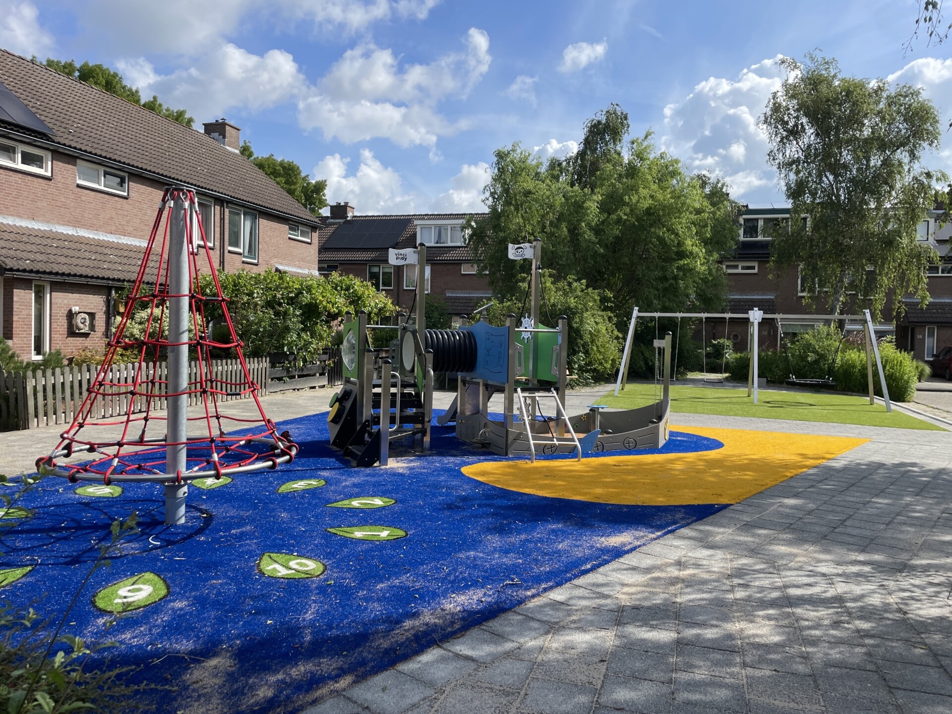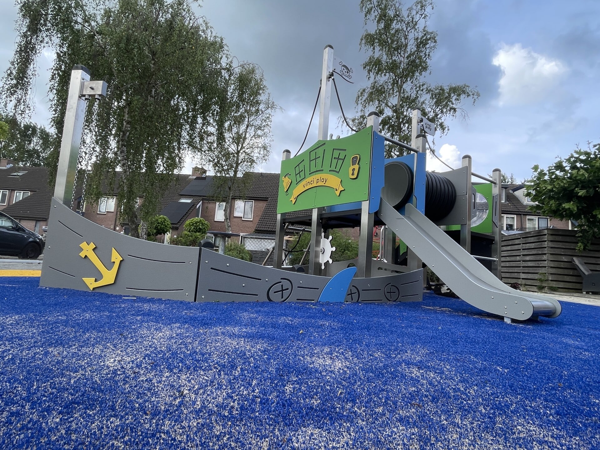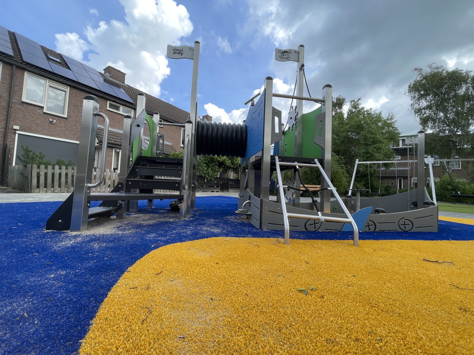 Gekozen is voor de een Speelschip uit de Steel+ serie voorzien van veel speelmogelijkheden.  Een brede schommelstelling met vogelnestschommel plus 2 standaardzitjes.  Ook is er een klimpiramide op deze speelplek.  Valdempend kunstgras is onder de toestellen aangelegd. Bij de boot is gekozen voor de kleuren geel en blauw, welke als strand en zee bij het speelschip horen.  In het kunstgras zijn ook een aantal kleurige inserts aangebracht om de speelwaarde nog verder te vergroten.