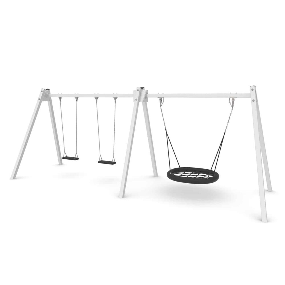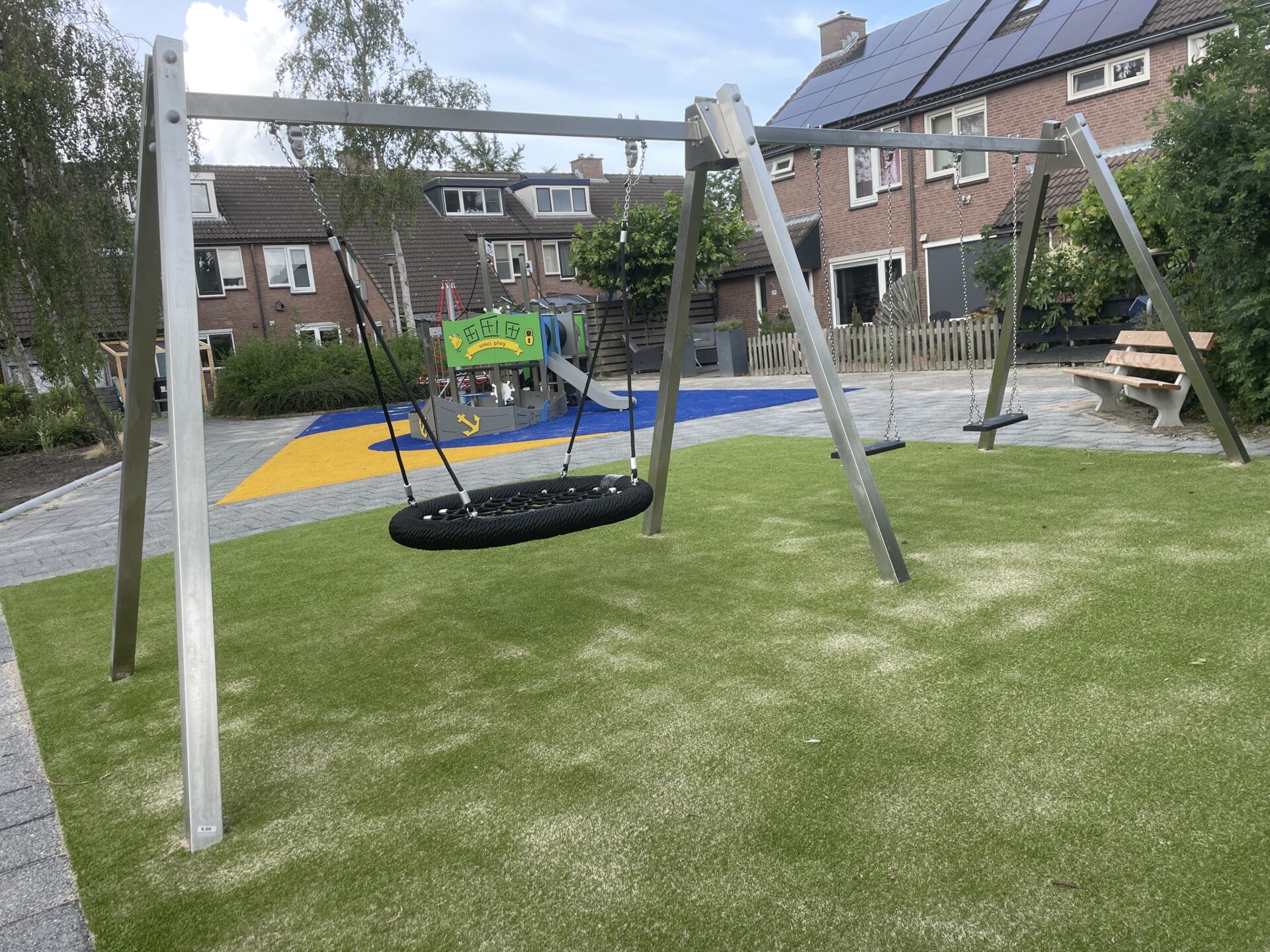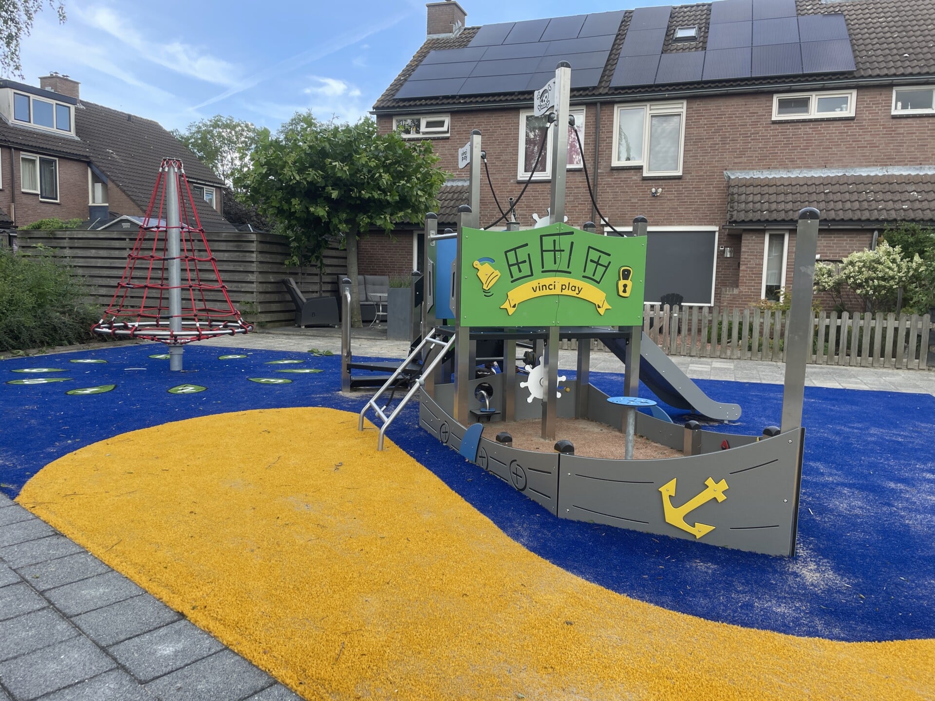 Gekozen is voor de een Speelschip uit de Steel+ serie voorzien van veel speelmogelijkheden.  Een brede schommelstelling met vogelnestschommel plus 2 standaardzitjes.  Ook is er een klimpiramide op deze speelplek.  Valdempend kunstgras is onder de toestellen aangelegd. Bij de boot is gekozen voor de kleuren geel en blauw, welke als strand en zee bij het speelschip horen.  In het kunstgras zijn ook een aantal kleurige inserts aangebracht om de speelwaarde nog verder te vergroten.