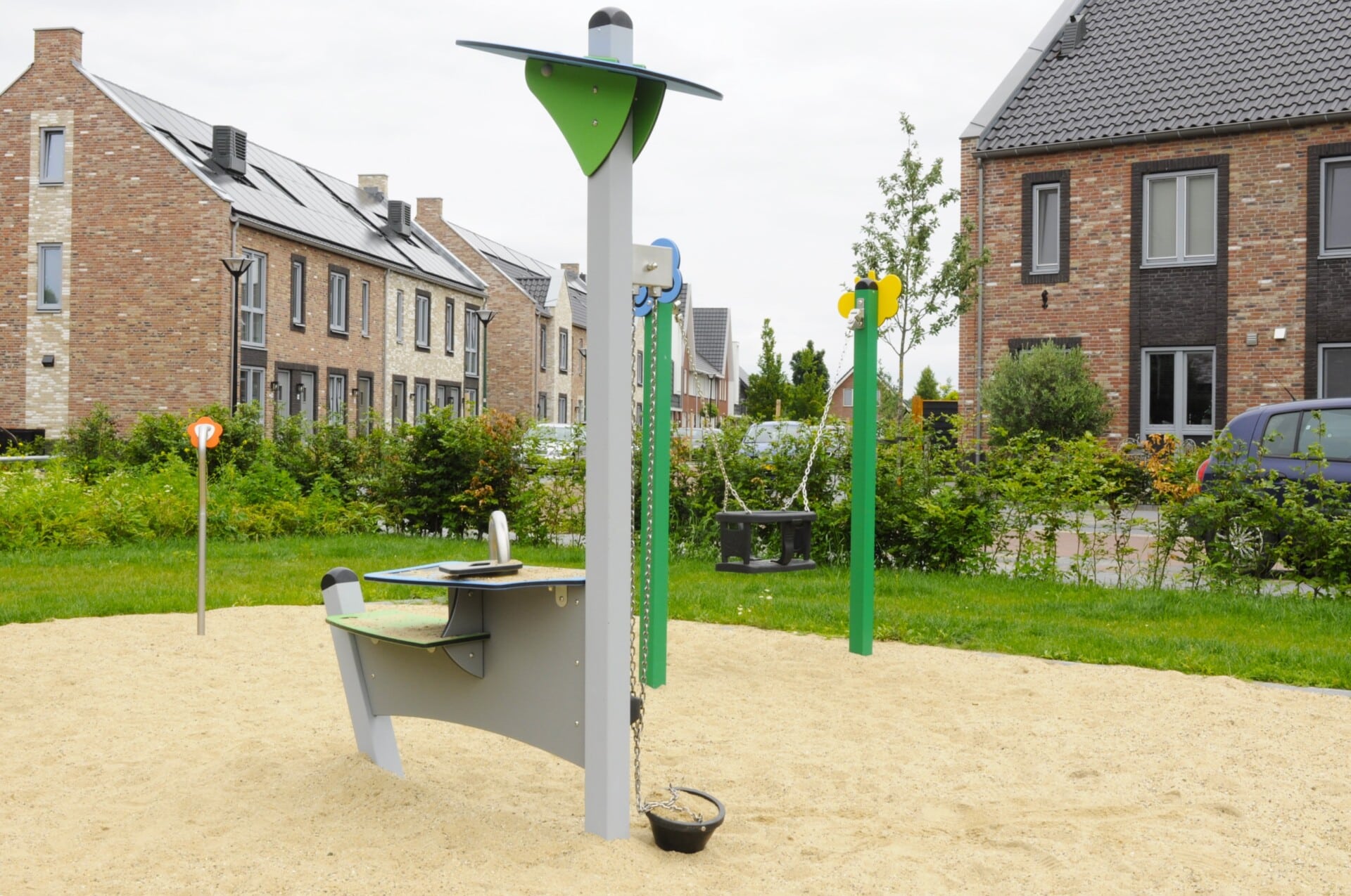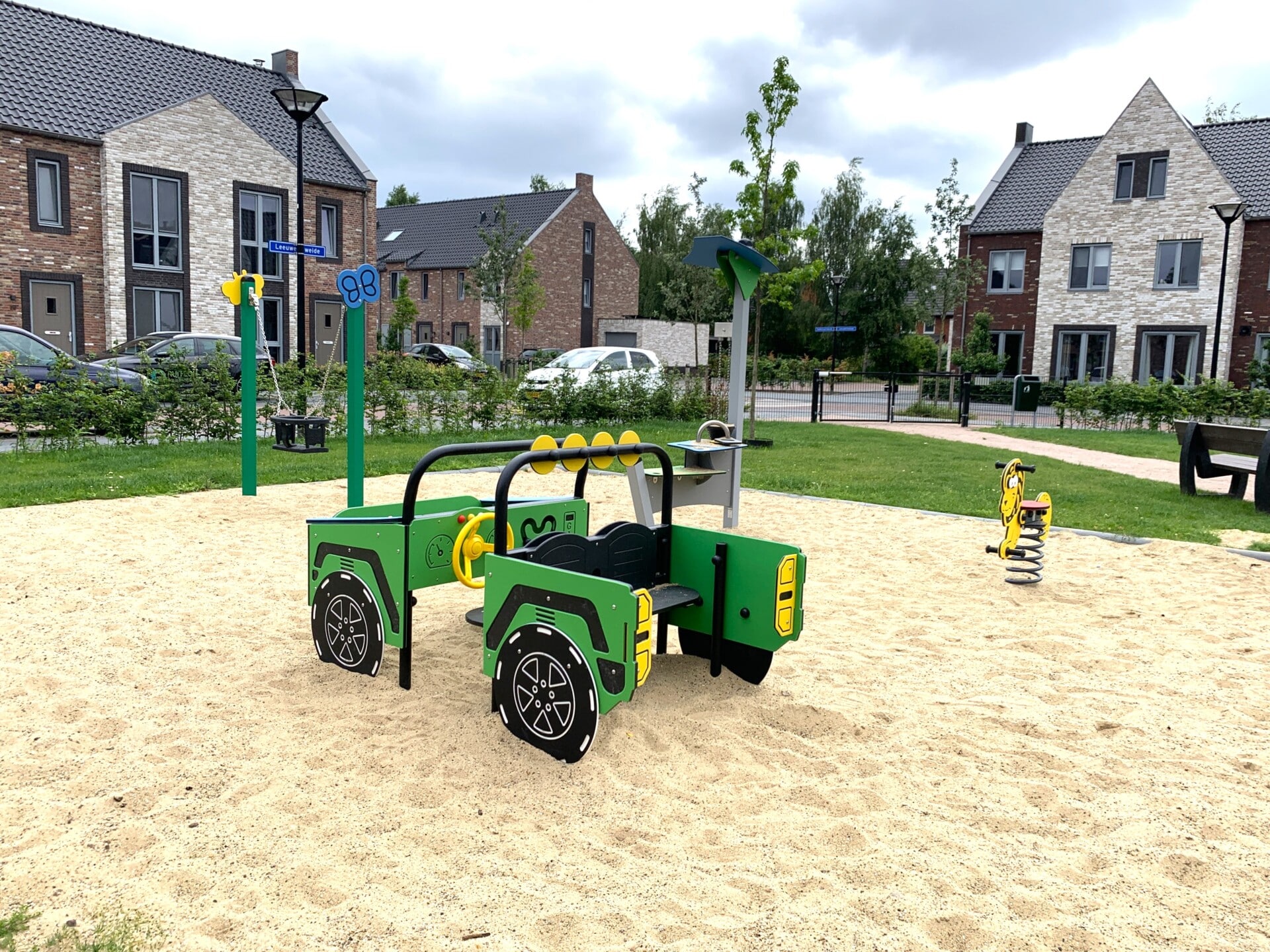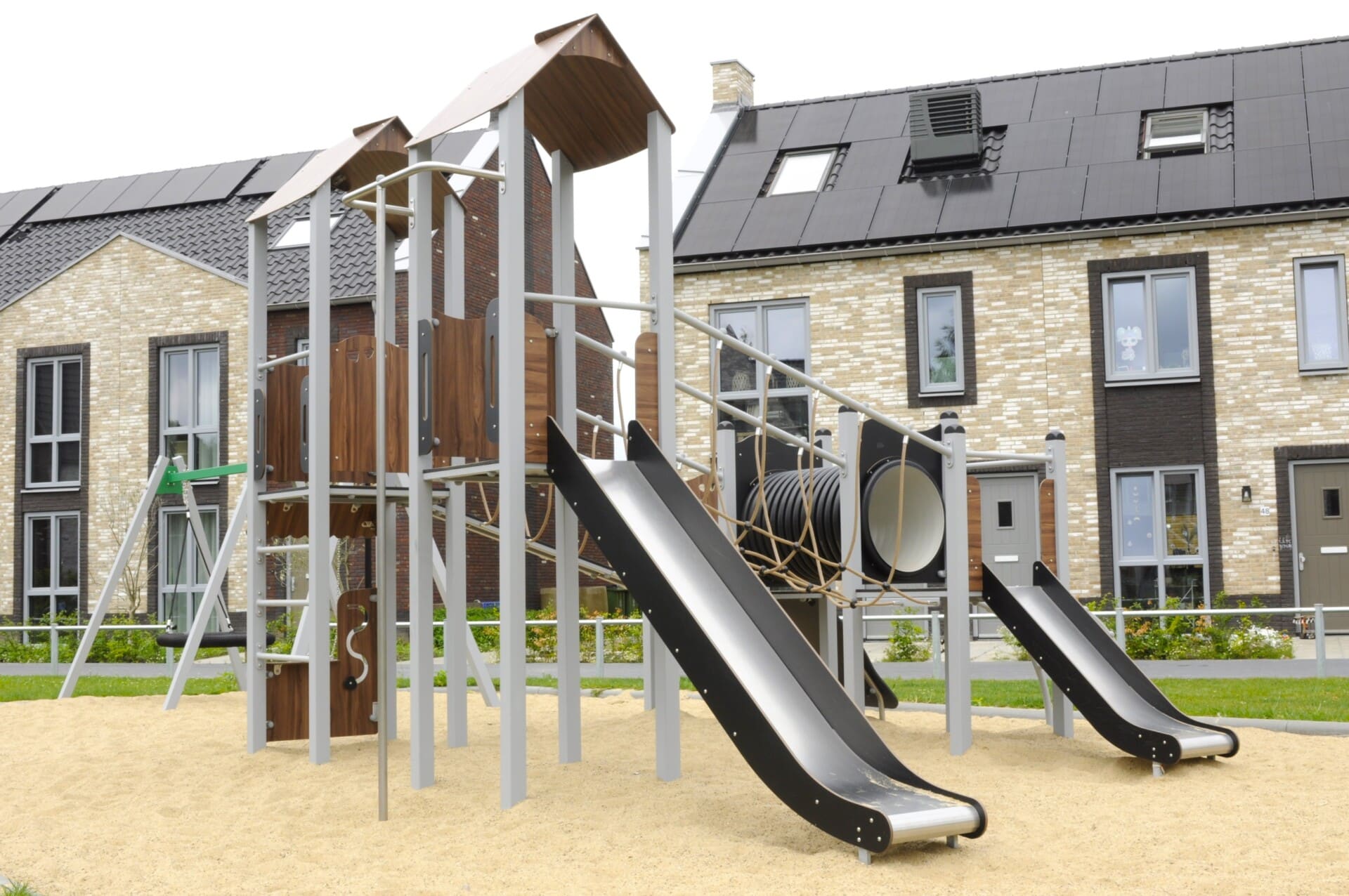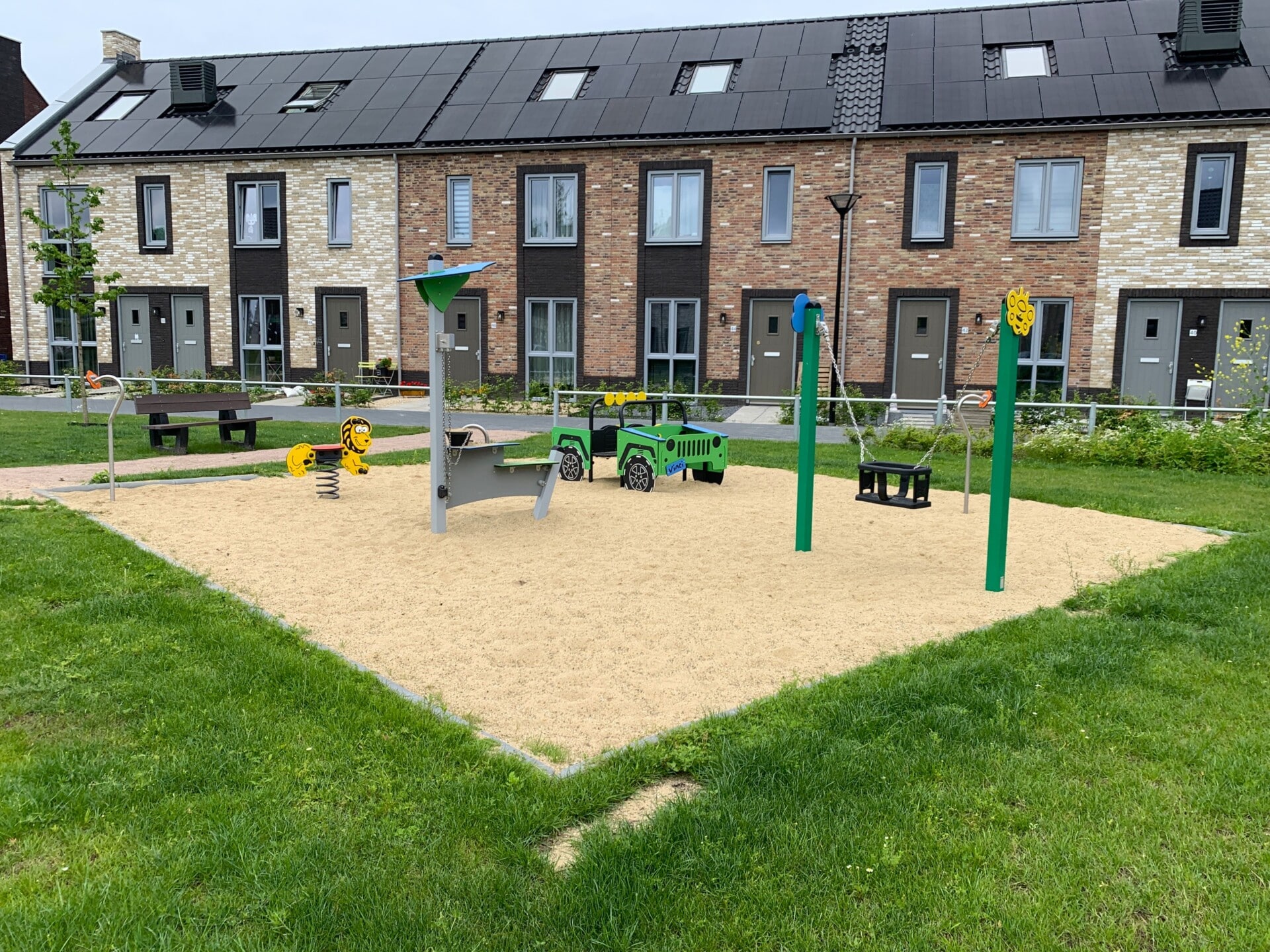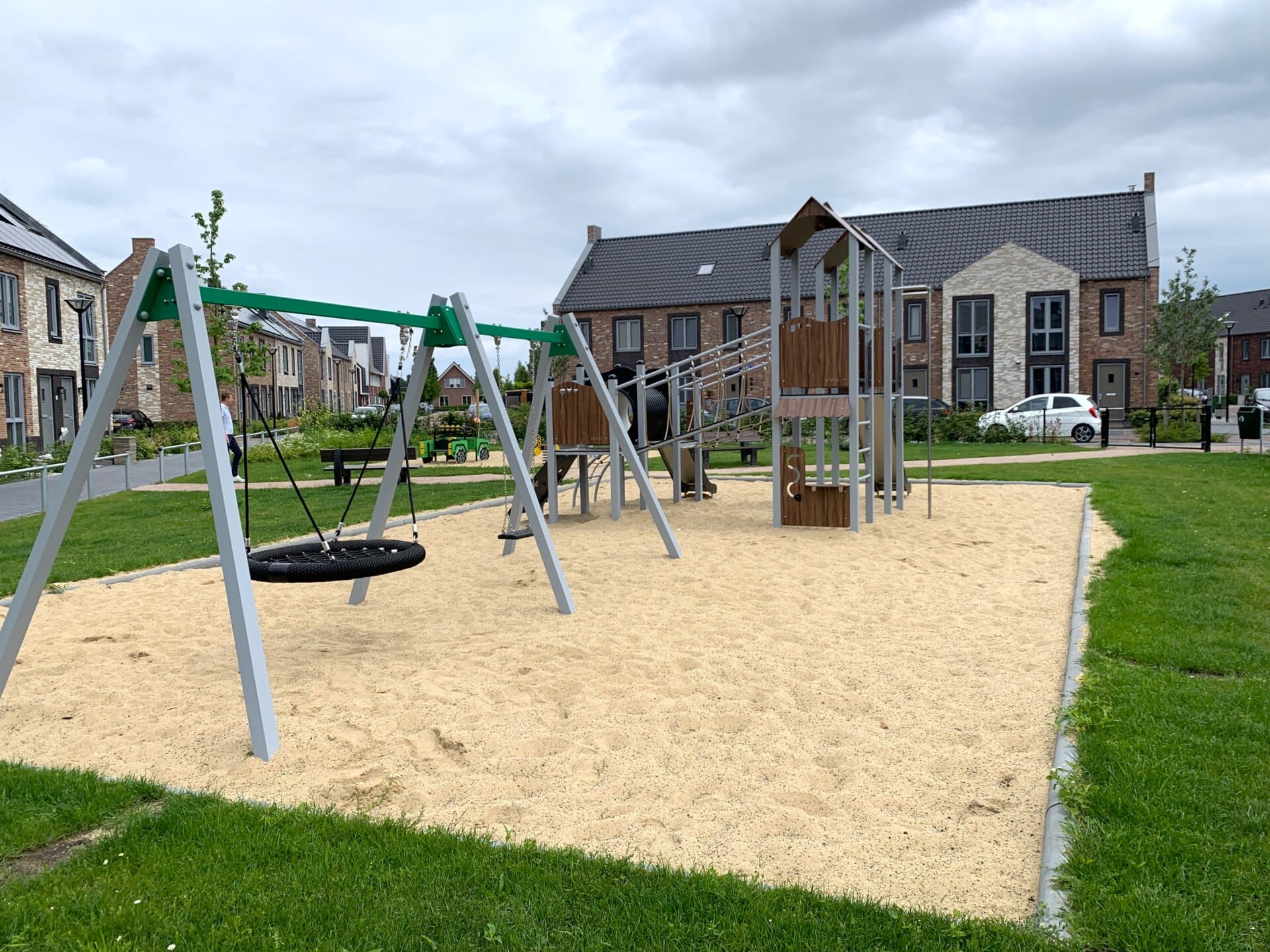Voor de wat oudere jeugd een groot speelkasteel bestaande uit 4 torens met veel verschillende bruggen,  klim-klauter opgangen en 2 glijbanen.  Ook een gecombineerde vogelnest – standaard schommel is voor de kinderen aanwezig.  Op de naastgelegen speelplek is de focus meer op de jongste kinderen.  Een zandtakel, vrolijke veerwip, een stoere speeljeep, kletsbloemen en een peuterschommeltje maken dit tot een leuke plek waar de kinderen fijn kunnen spelen en bewegen.