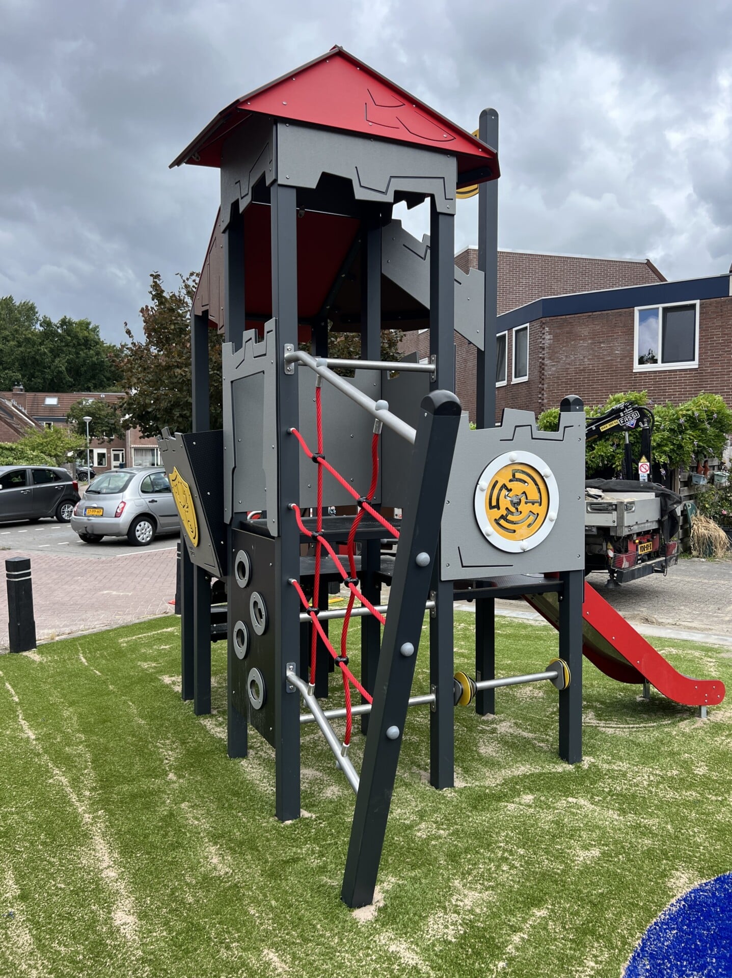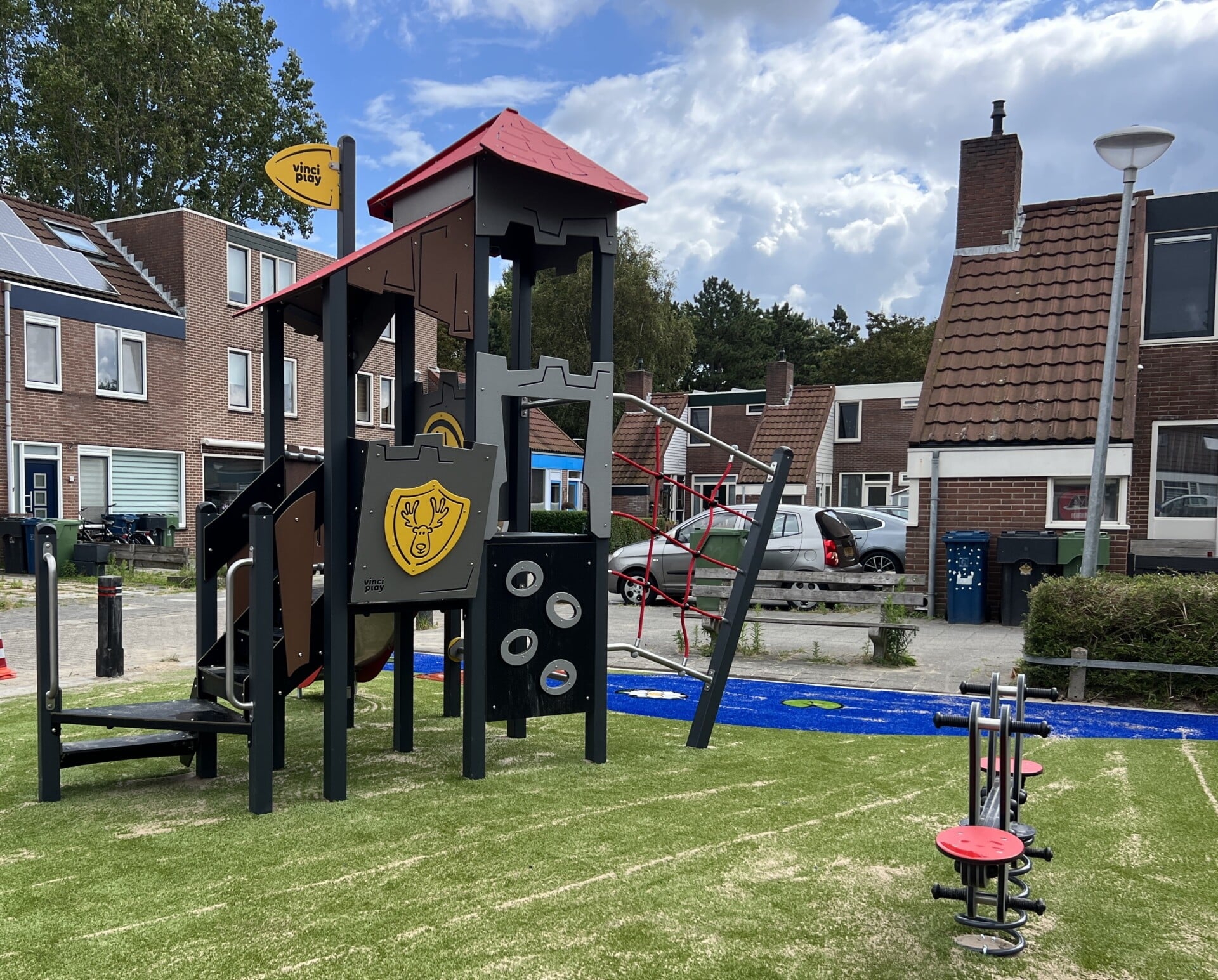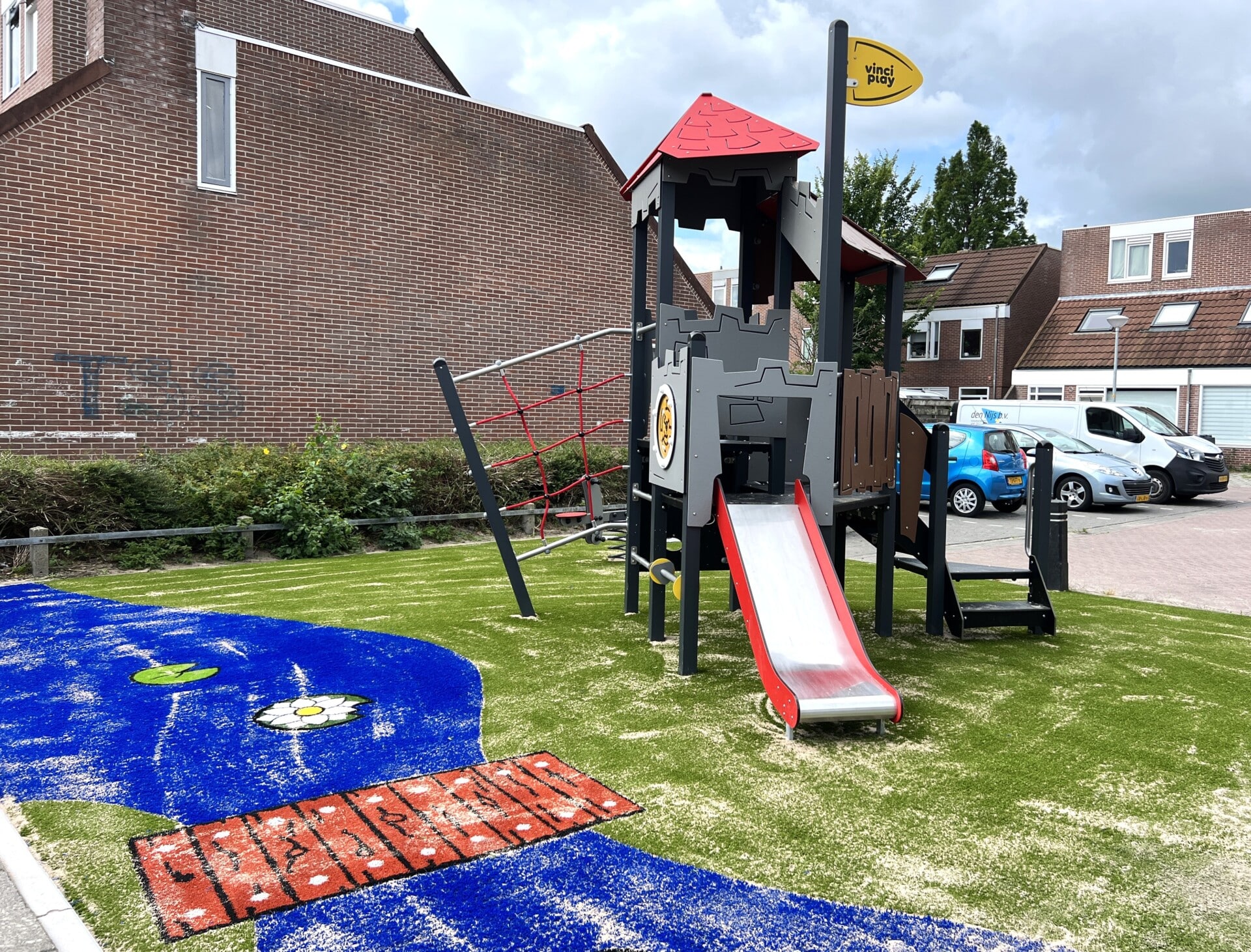 Voor Gemeente Alkmaar mochten wij speelplek Vlietwaard renoveren.  Oude toestellen eruit en een mooie nieuwe speelplek maken.  Keuze viel op de CS3003 uit de Castillo serie van Vinciplay.  Dit uitdagende speelkasteel heeft veel leuke speelmogelijkheden die op een betrekkelijk kleine speelplek passen.  Glijden, klimmen, rollenspel, diverse speelaanleidingen… je vind het allemaal op dit leuke toestel.  Bijpassend een fijne duo wip op het valdempende kunstgras welke is voorzien van een aantal kleurrijke toevoegingen zoals een “slotgracht met brug” en een verstopte vleermuis.