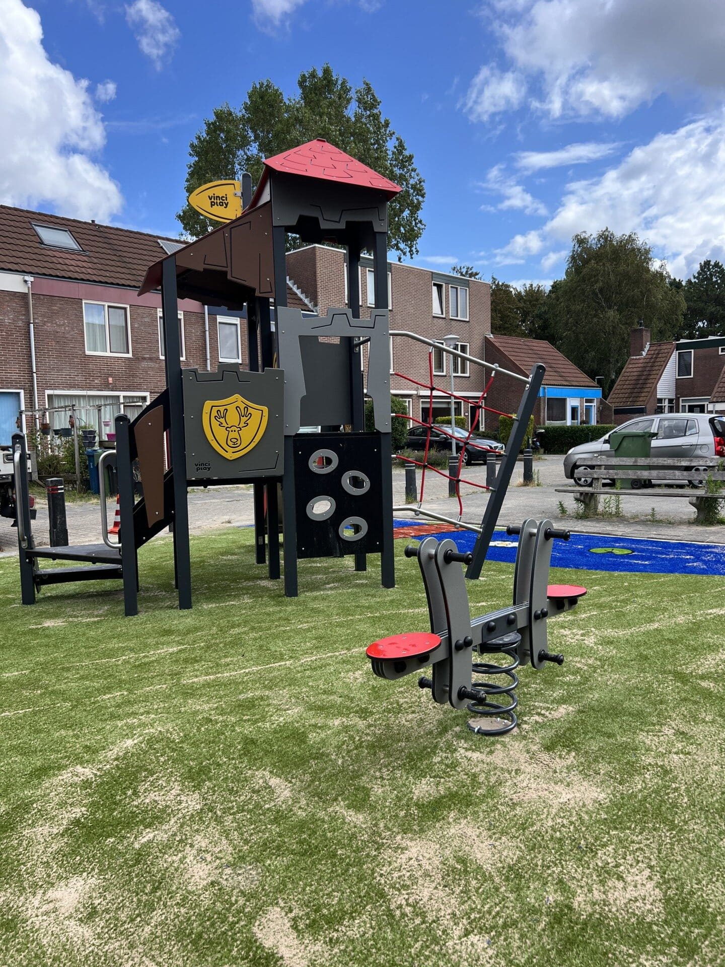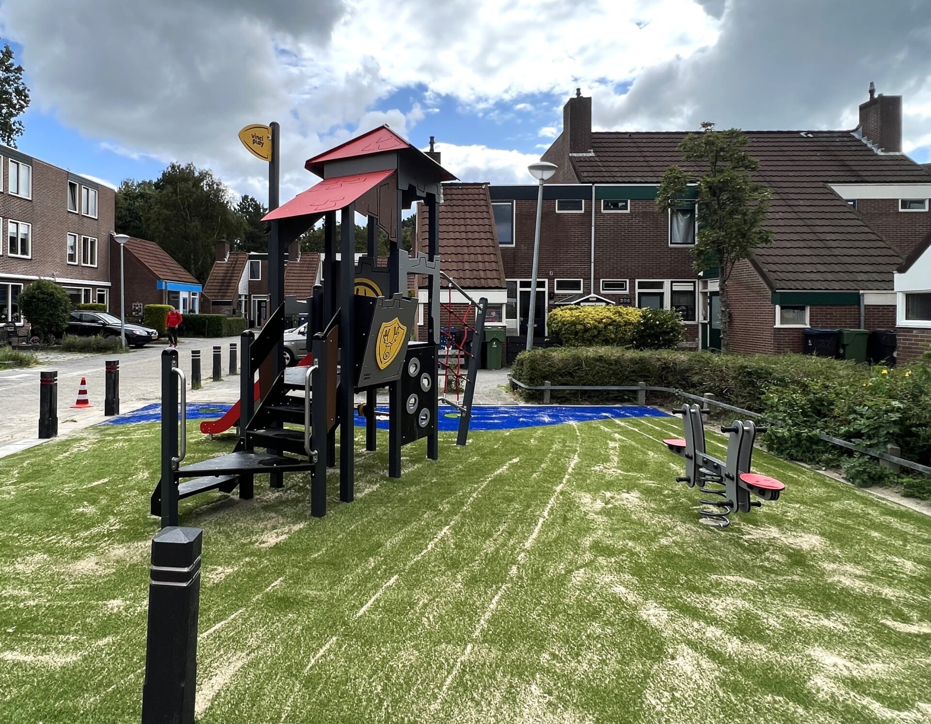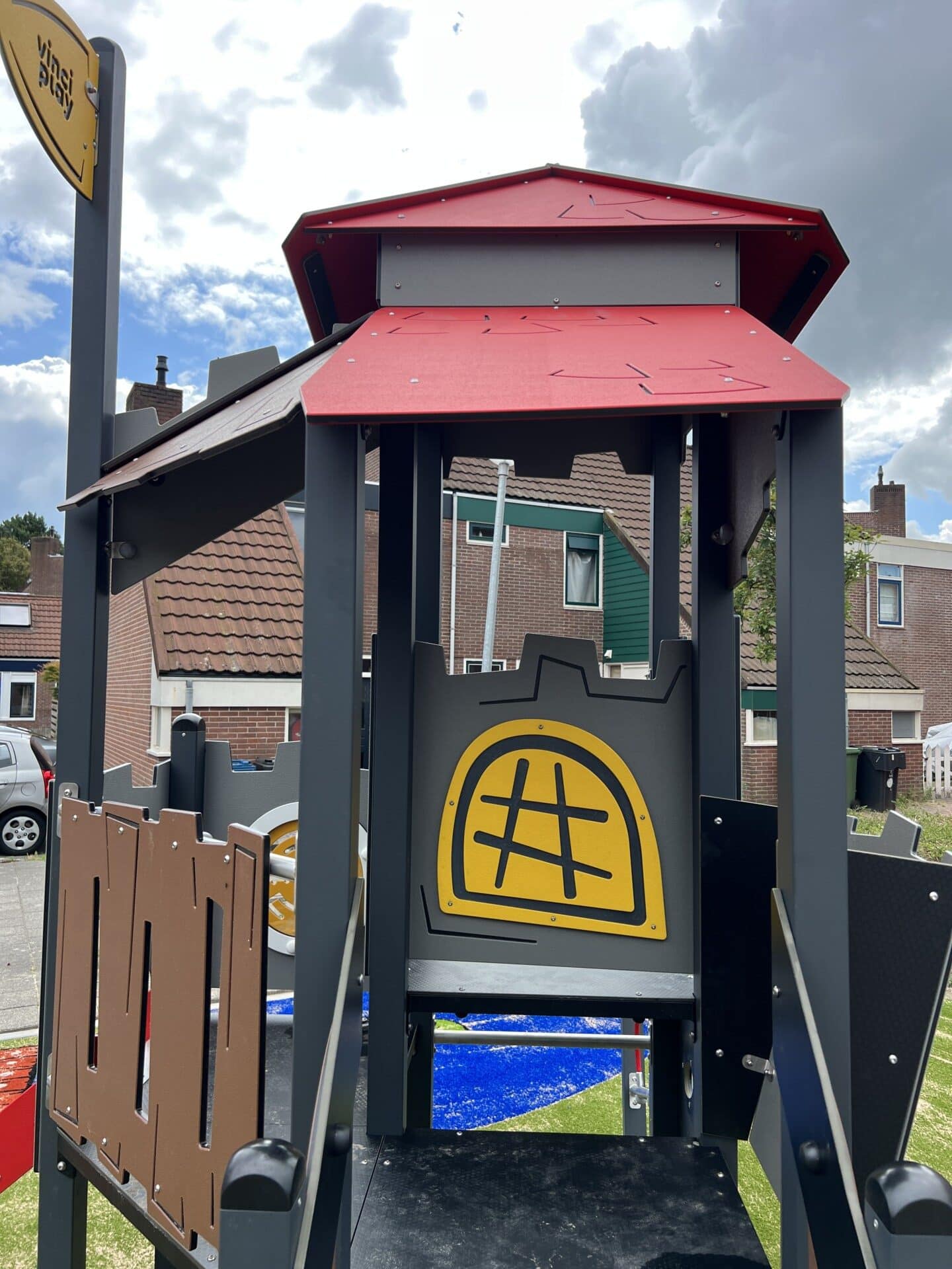 Voor Gemeente Alkmaar mochten wij speelplek Vlietwaard renoveren.  Oude toestellen eruit en een mooie nieuwe speelplek maken.  Keuze viel op de CS3003 uit de Castillo serie van Vinciplay.  Dit uitdagende speelkasteel heeft veel leuke speelmogelijkheden die op een betrekkelijk kleine speelplek passen.  Glijden, klimmen, rollenspel, diverse speelaanleidingen… je vind het allemaal op dit leuke toestel.  Bijpassend een fijne duo wip op het valdempende kunstgras welke is voorzien van een aantal kleurrijke toevoegingen zoals een “slotgracht met brug” en een verstopte vleermuis.