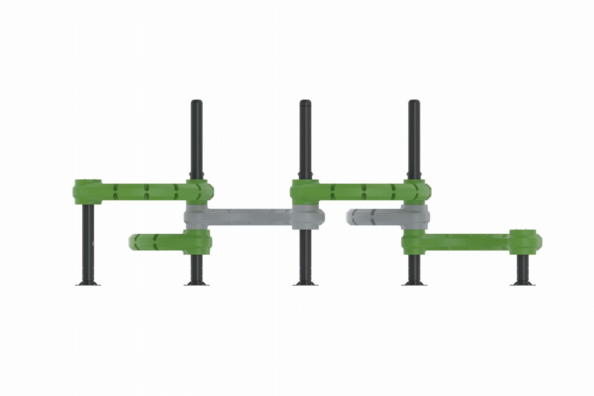 De Arc Serie is een modulaire klimunit die speciaal is ontworpen om het evenwichtsgevoel van kinderen te verbeteren. Het polyethyleen element maakt het mogelijk om doolhofachtige varianten te creëren door de gebogen blokken aan begin- en eindpunten met horizontale buizen te verbinden. De veerelementen zorgen voor een uitdagende klimervaring, waarbij kinderen hun grove motoriek verder ontwikkelen. De kleuren zijn op verzoek aanpasbaar.