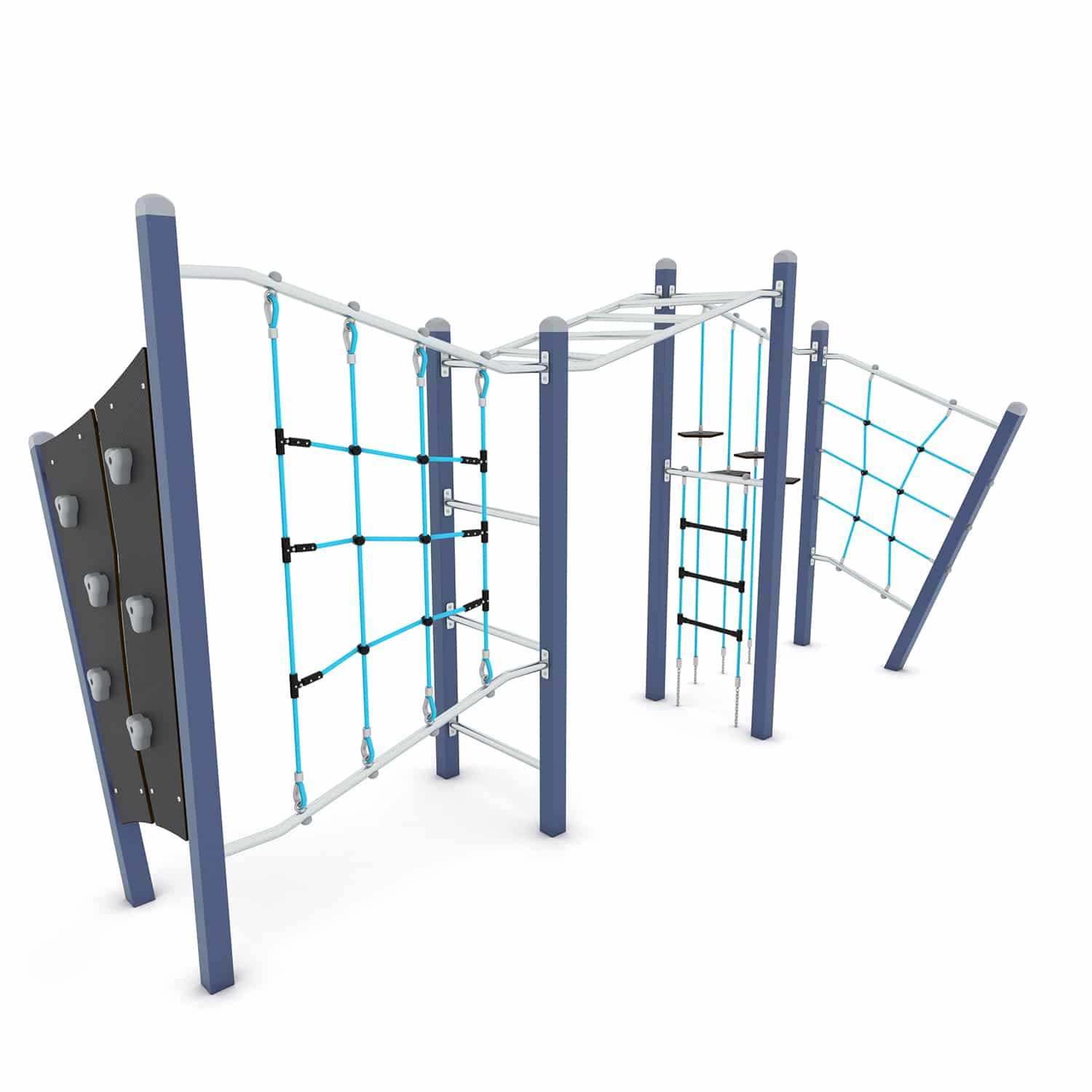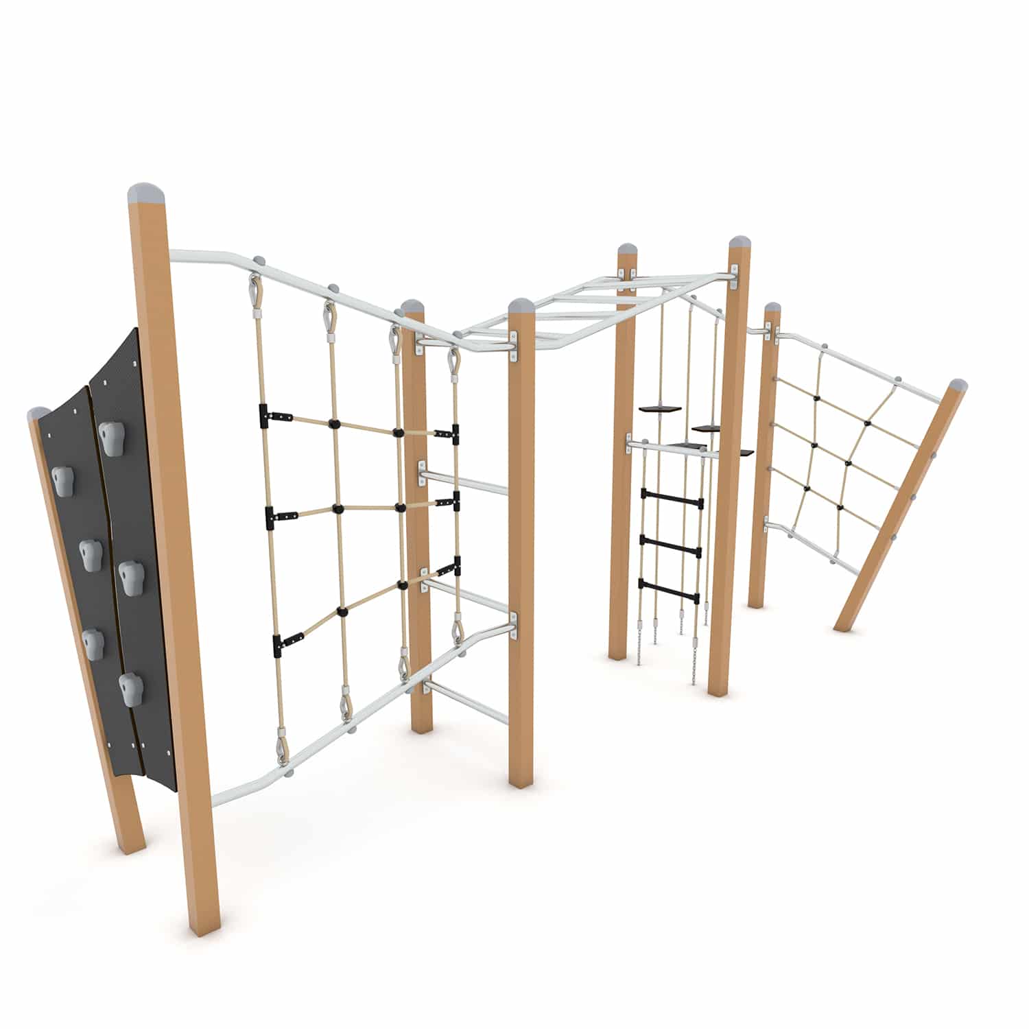 Stoer klimparcours waarop de jeugd de mouwen voor moet opstropen. Uitgevoerd met klimwand, klimnetten en hangbrug.