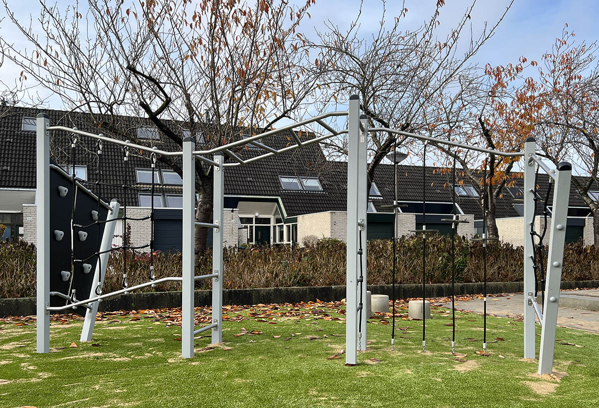 Stoer klimparcours waarop de jeugd de mouwen voor moet opstropen. Uitgevoerd met klimwand, klimnetten en hangbrug.