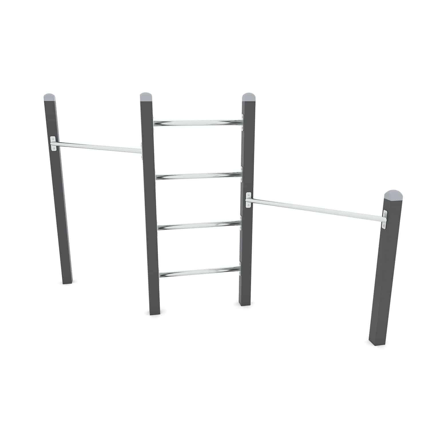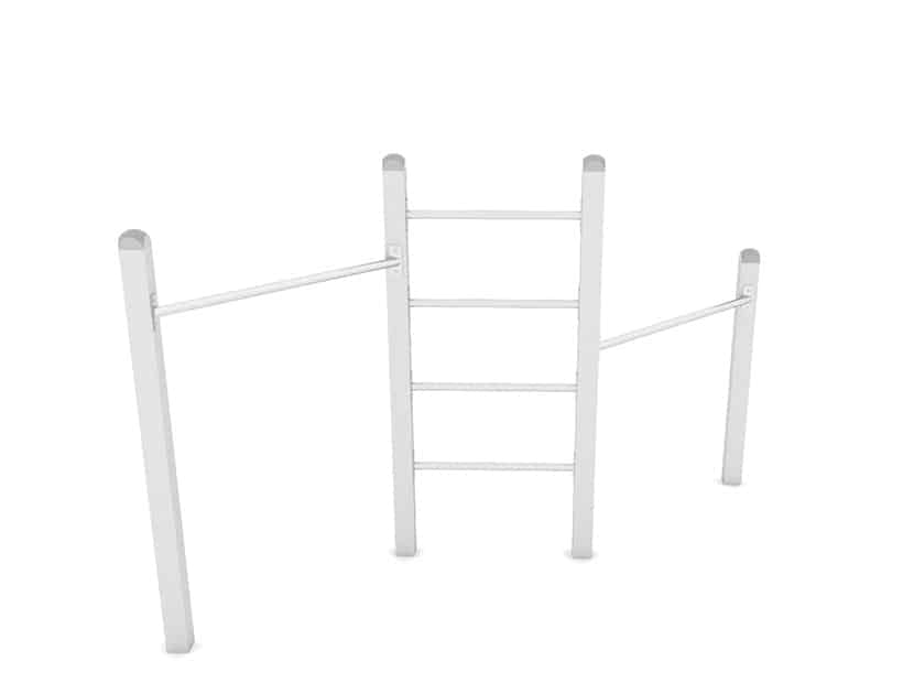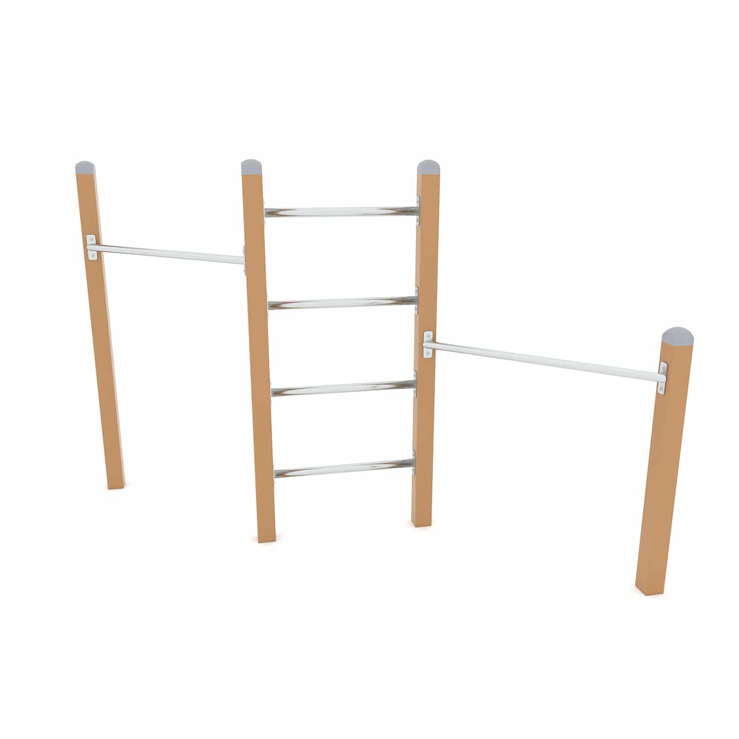 Een leuke twist aan een traditioneel duikelrek is deze uitvoering met klimsporten in het midden. Duikelstangen bevinden zich op ca. 100 en 145 cm.