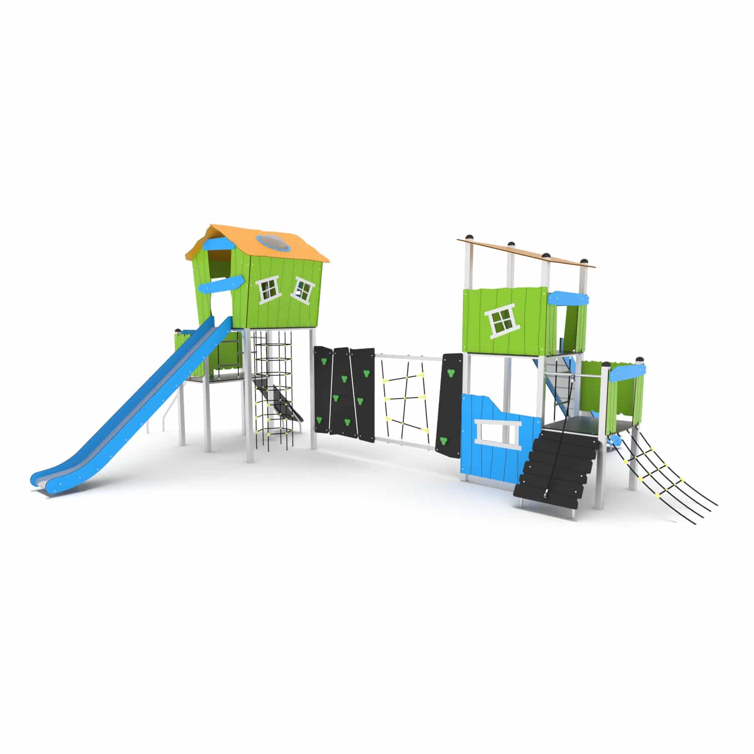 Speelcombinatie ‘S1’ met 2 torens met glijstangen, klimelementen en 2 standaard glijbanen