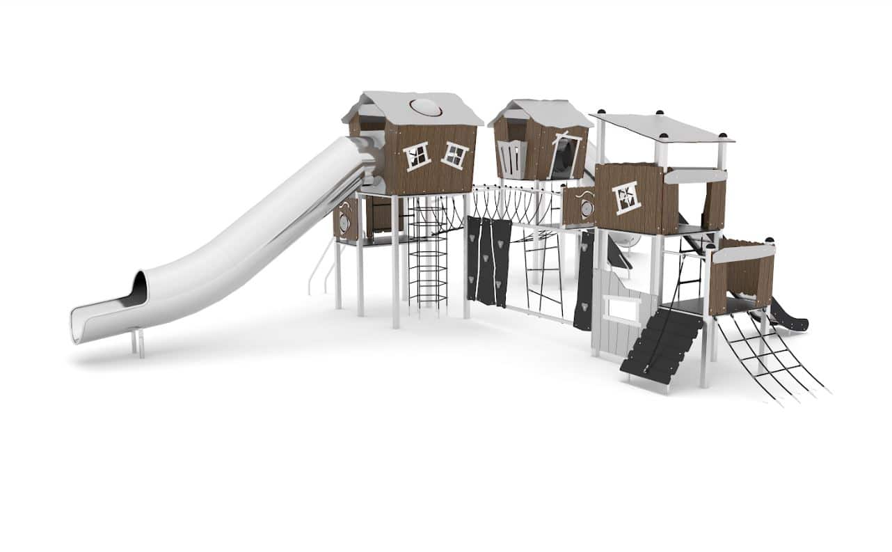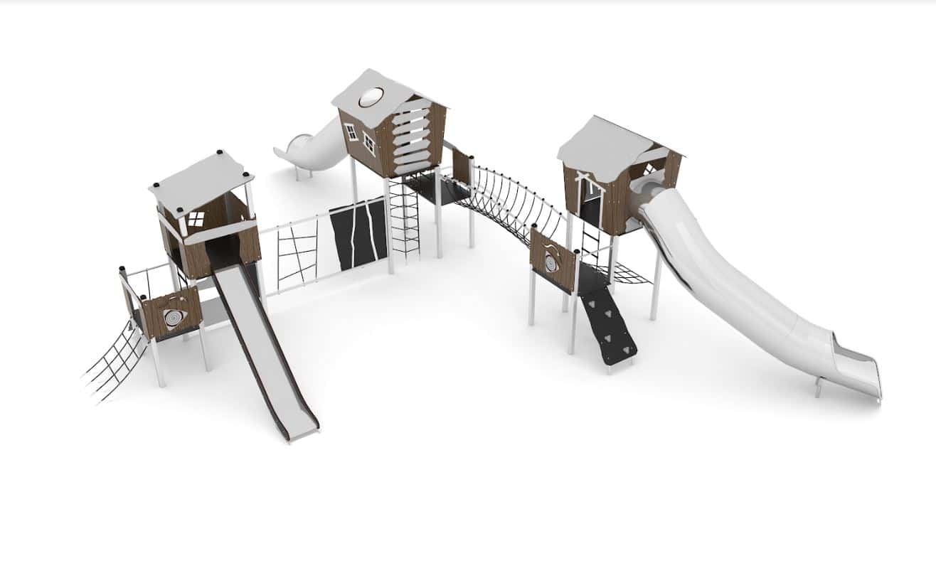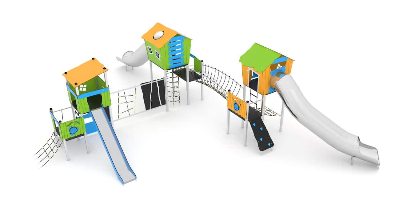 Speelcombinatie ‘S1’ met 3 torens met glijstangen, klimelementen, netbrug en 3 standaard glijbanen