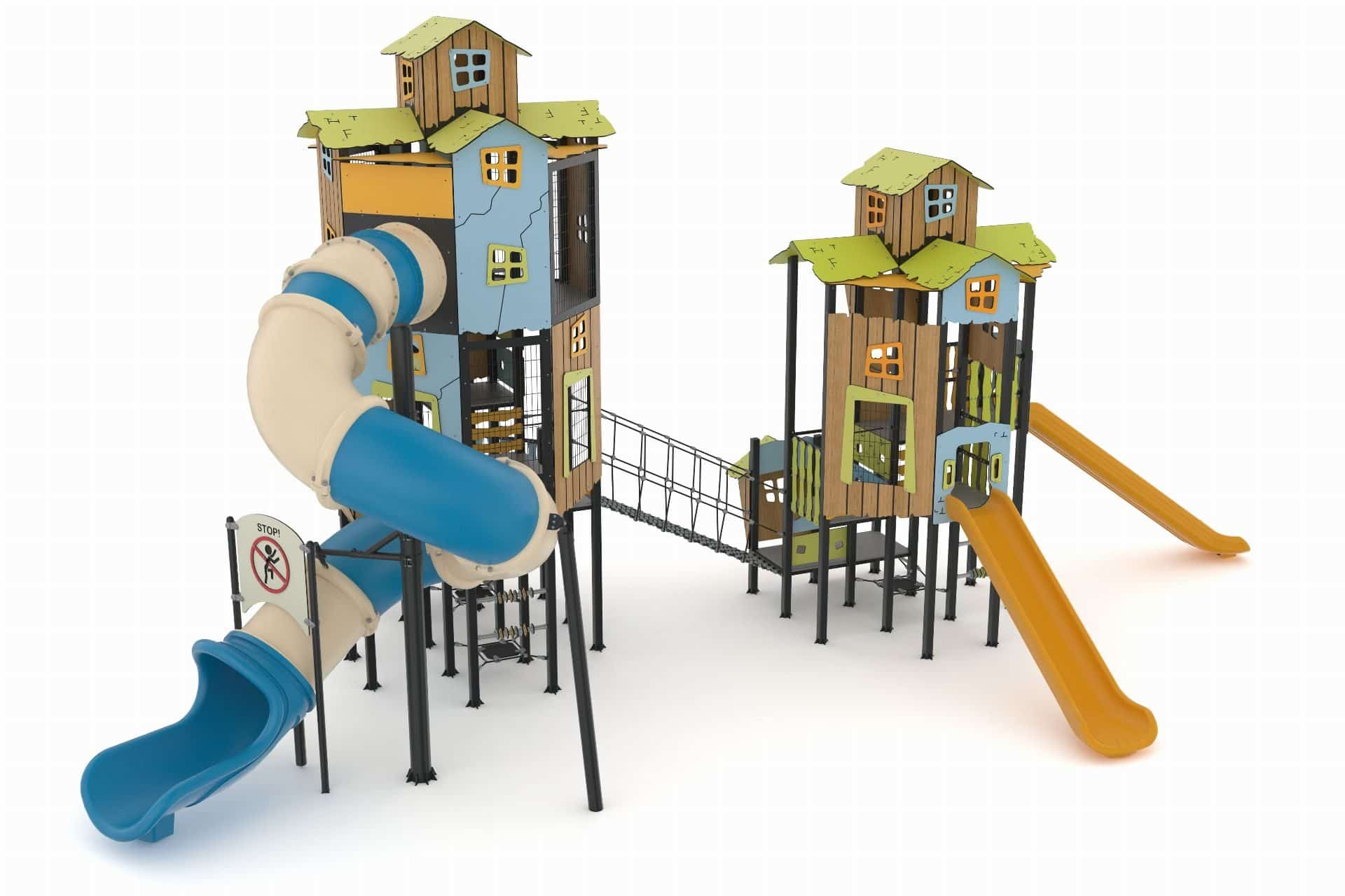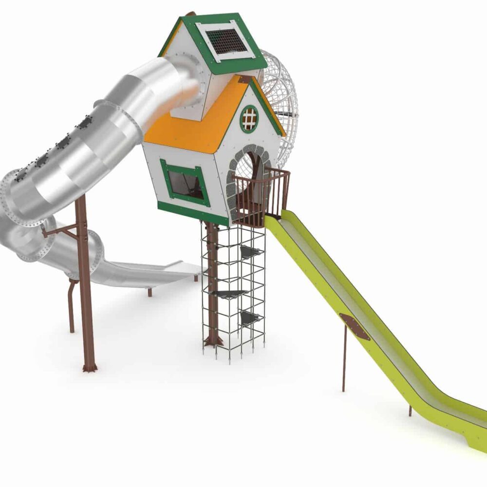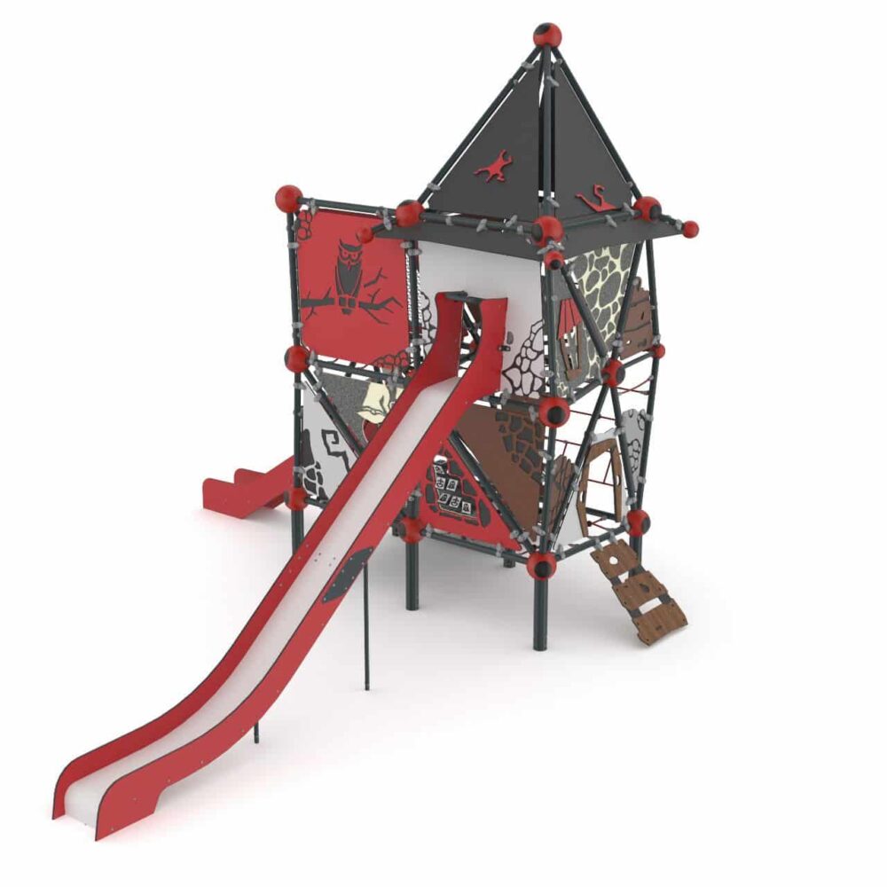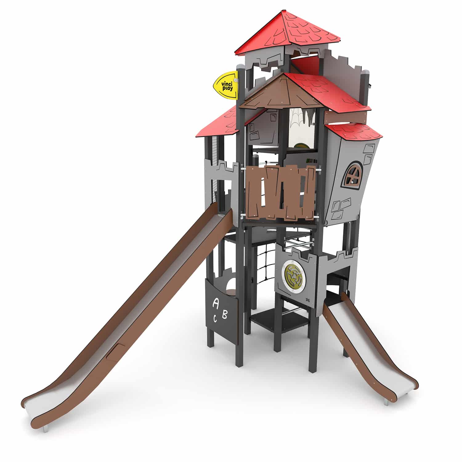 Multilevel kasteeltoren met klimnet en twee glijbanen
