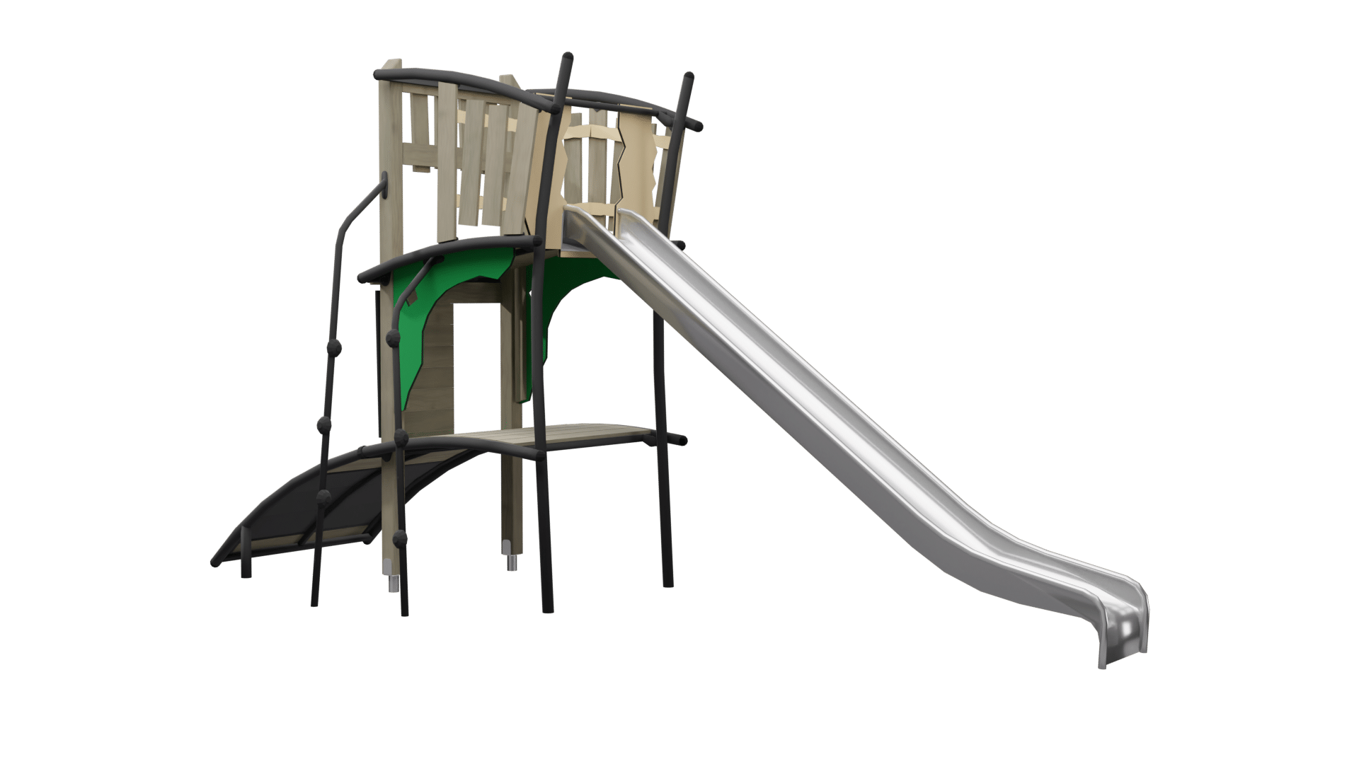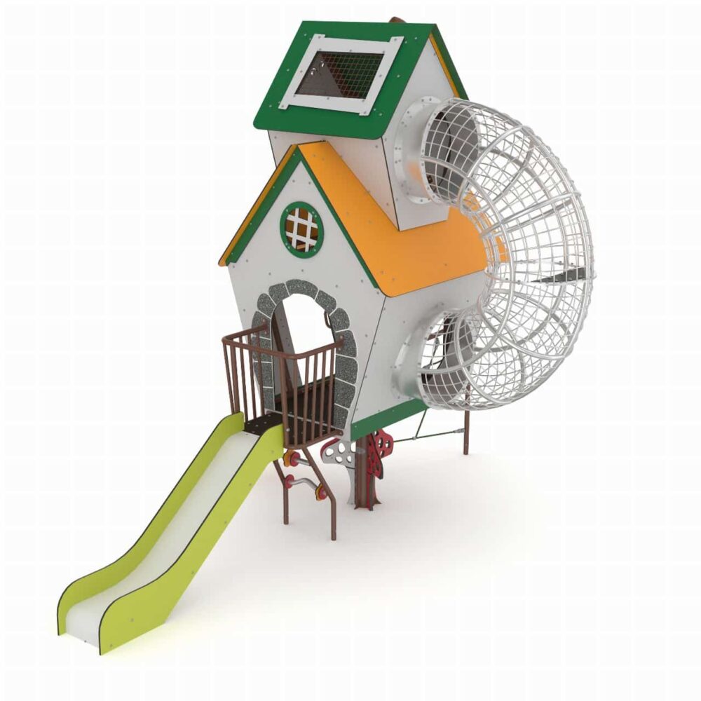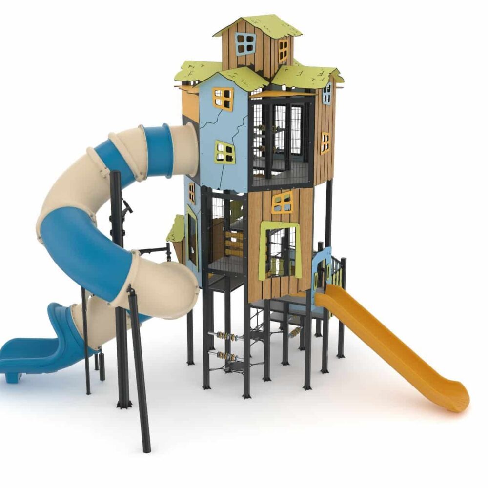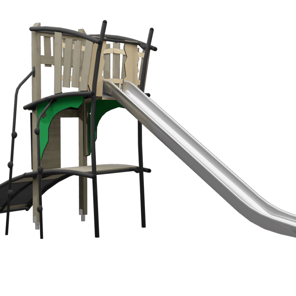 Multilevel kasteeltoren met klimnet en twee glijbanen
