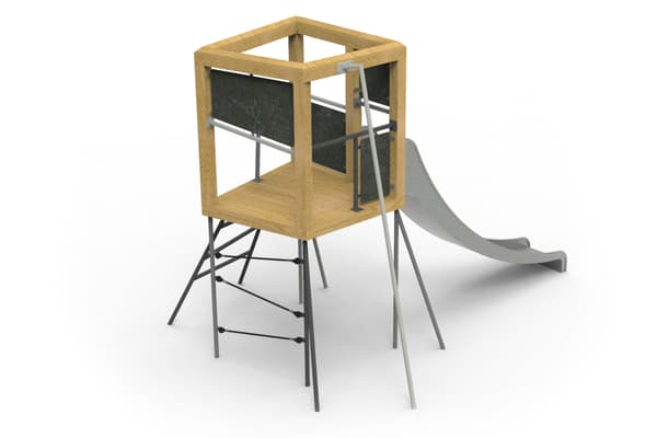 Abstracte glijtoren met verschillende klimopgangen en een glijbaanhoogte van 1.80 meter.