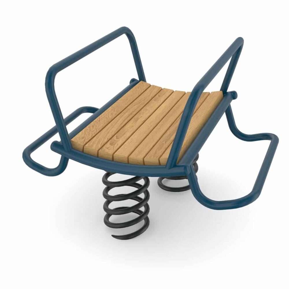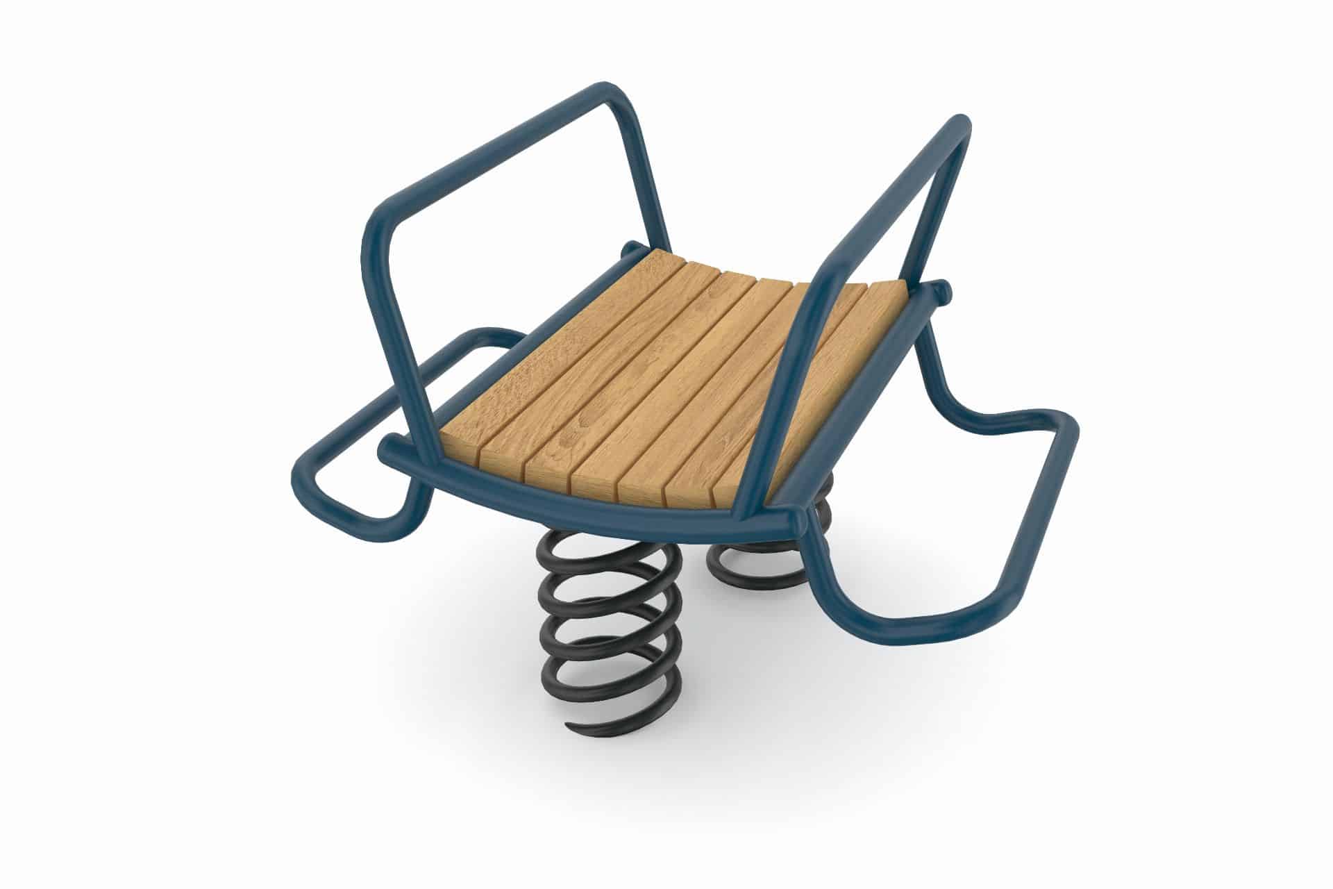 Tweepersoons veerwip met voetsteunen en handgrepen in geheel RVS. Een toestel dat vaak gebruikt wordt om eerst de kat uit de boom te kijken en te ervaren waartoe de zwaartekracht in staat is.