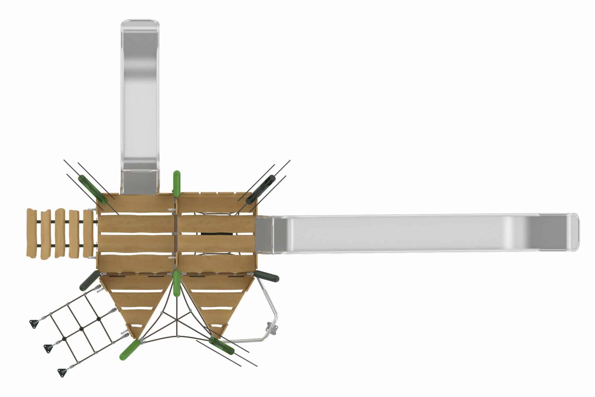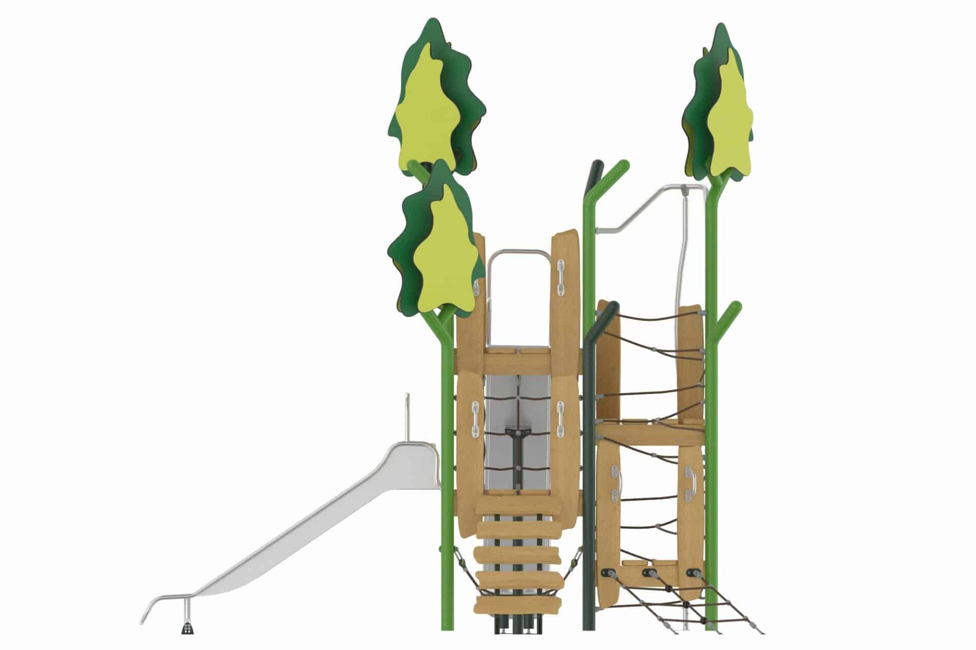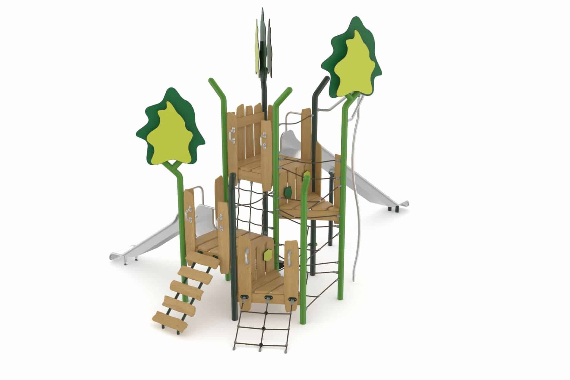 De Evergreen-serie speeltoestellen combineert eigentijdse materialen met een natuurlijke uitstraling. Het duurzame, robuuste frame van gepoedercoate stalen staanders in een organische vorm staat garant voor een lange levensduur. Robinia houten panelen en zorgvuldig gekozen natuurtinten geven de torens een warme en uitnodigende uitstraling die perfect past in elke omgeving.