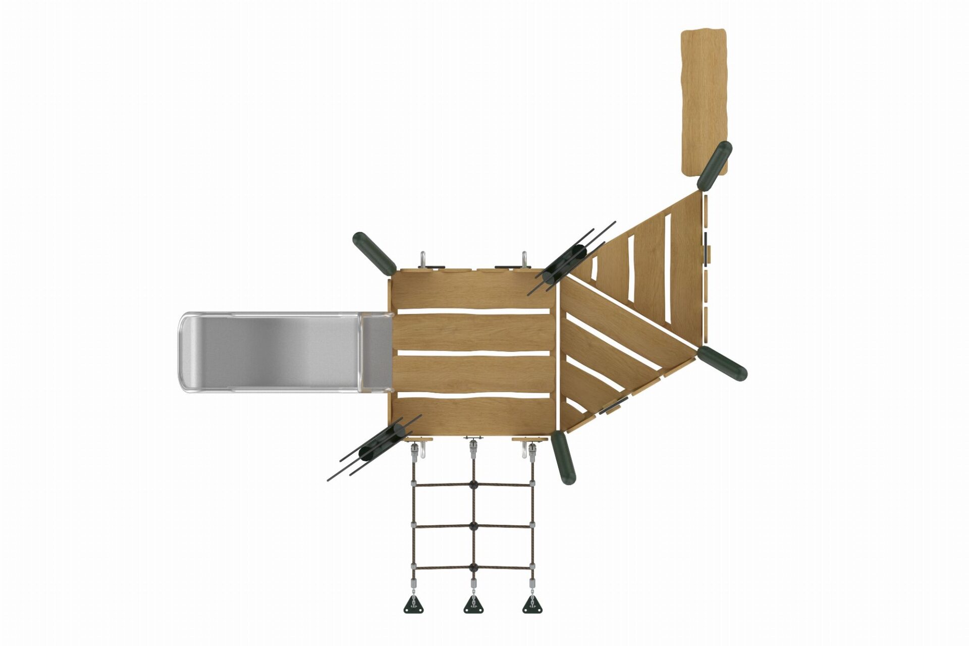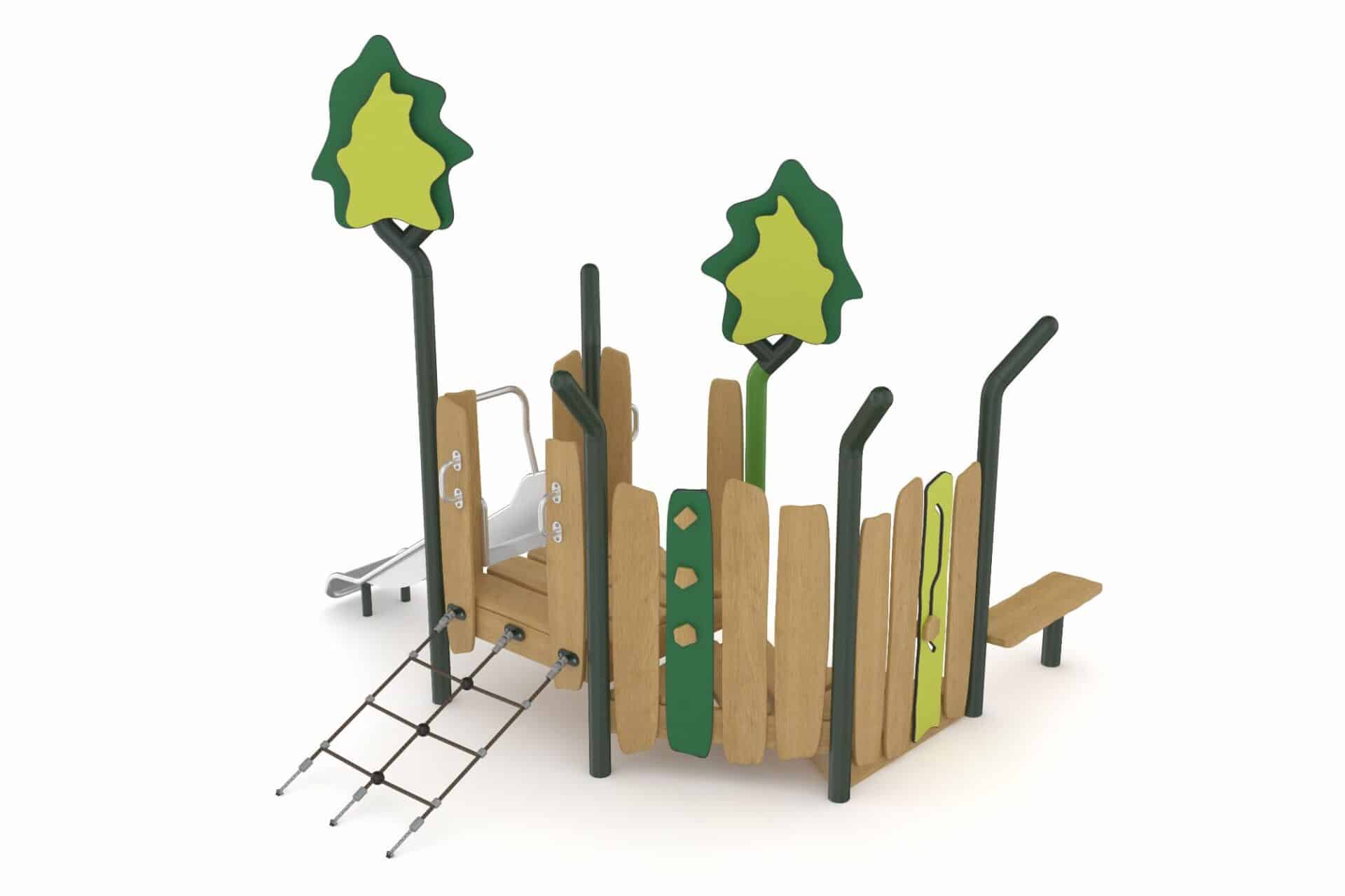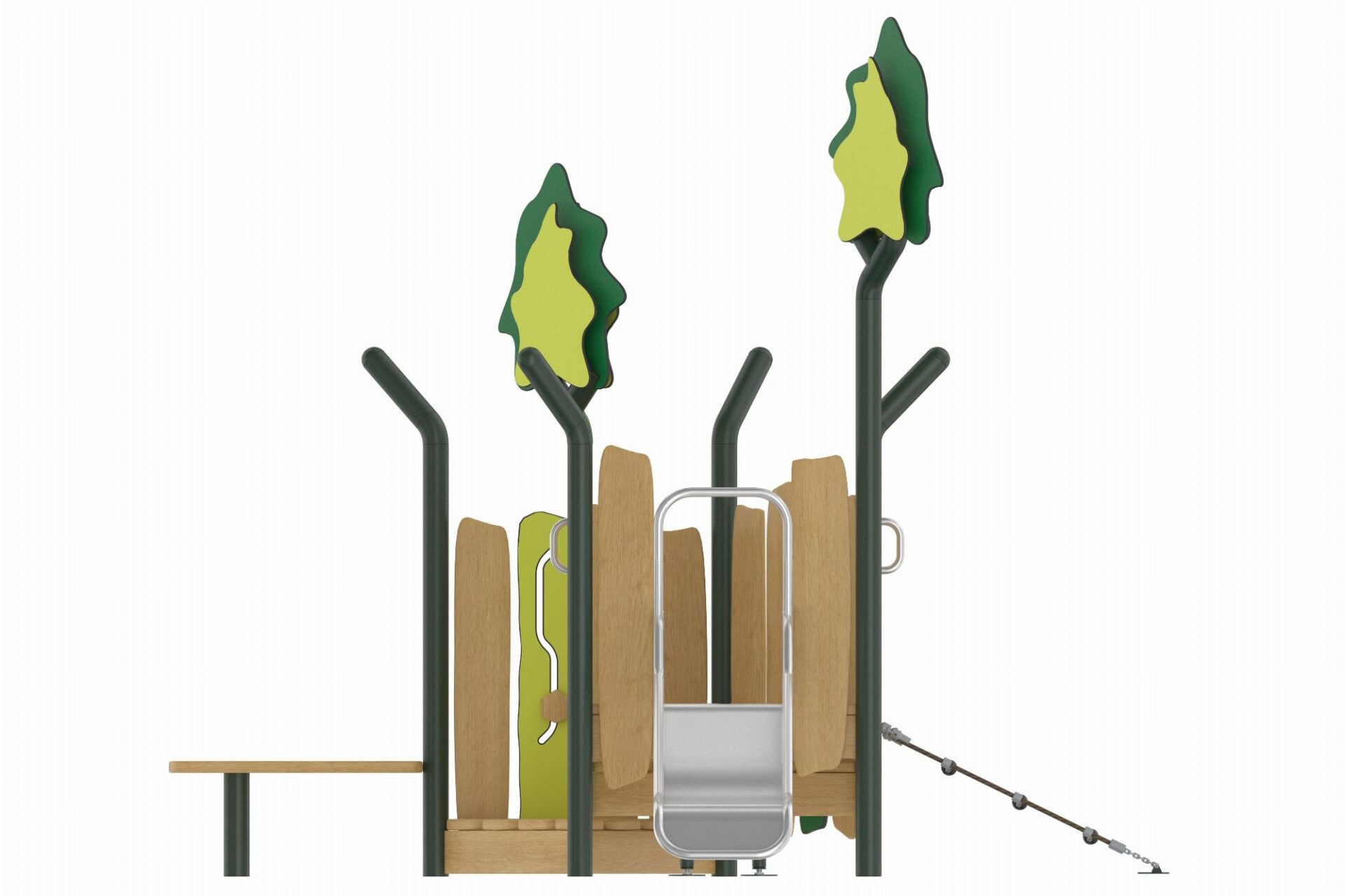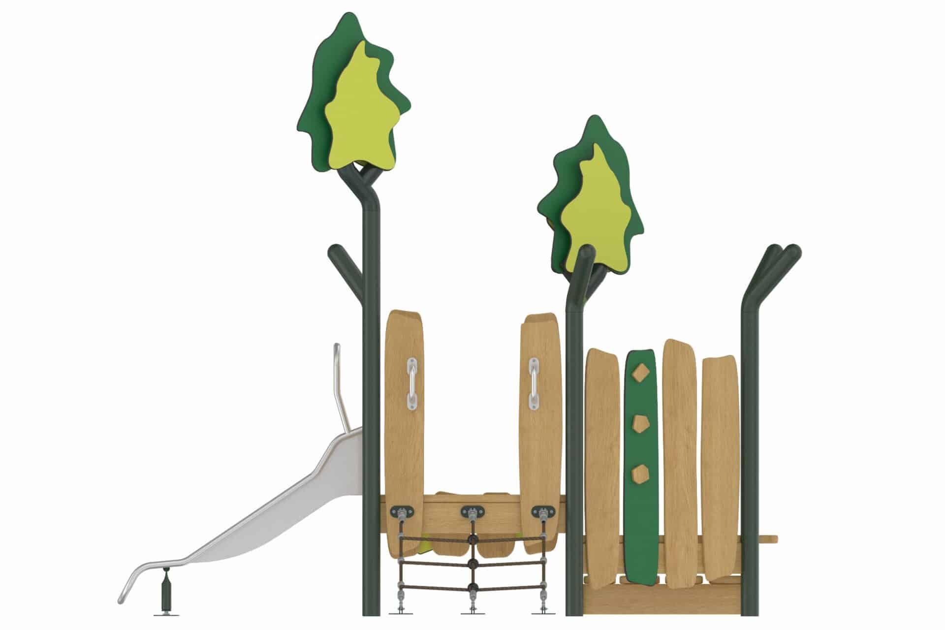 De Evergreen-serie speeltoestellen combineert eigentijdse materialen met een natuurlijke uitstraling. Het duurzame, robuuste frame van gepoedercoate stalen staanders in een organische vorm staat garant voor een lange levensduur. Robinia houten panelen en zorgvuldig gekozen natuurtinten geven de torens een warme en uitnodigende uitstraling die perfect past in elke omgeving.