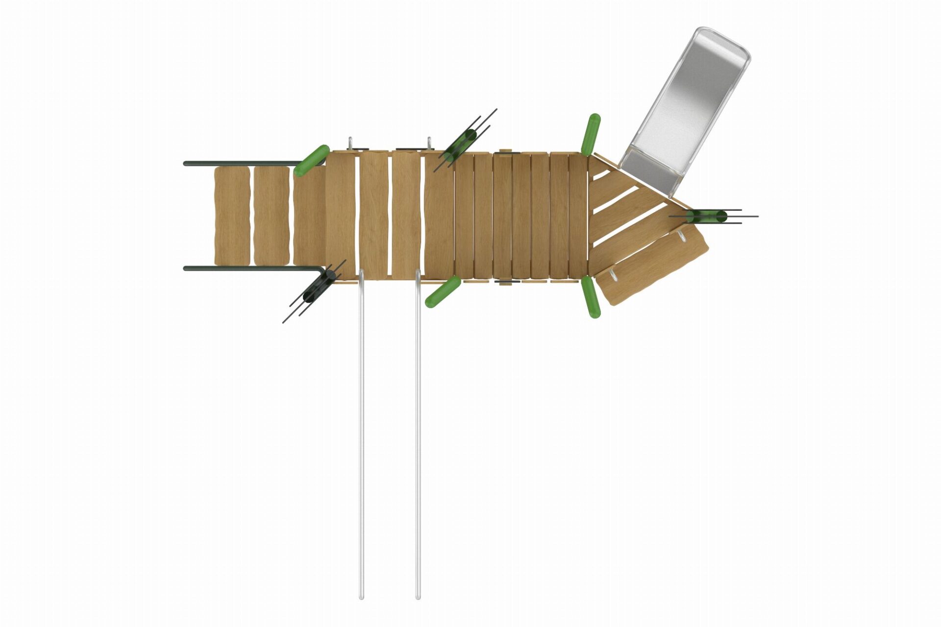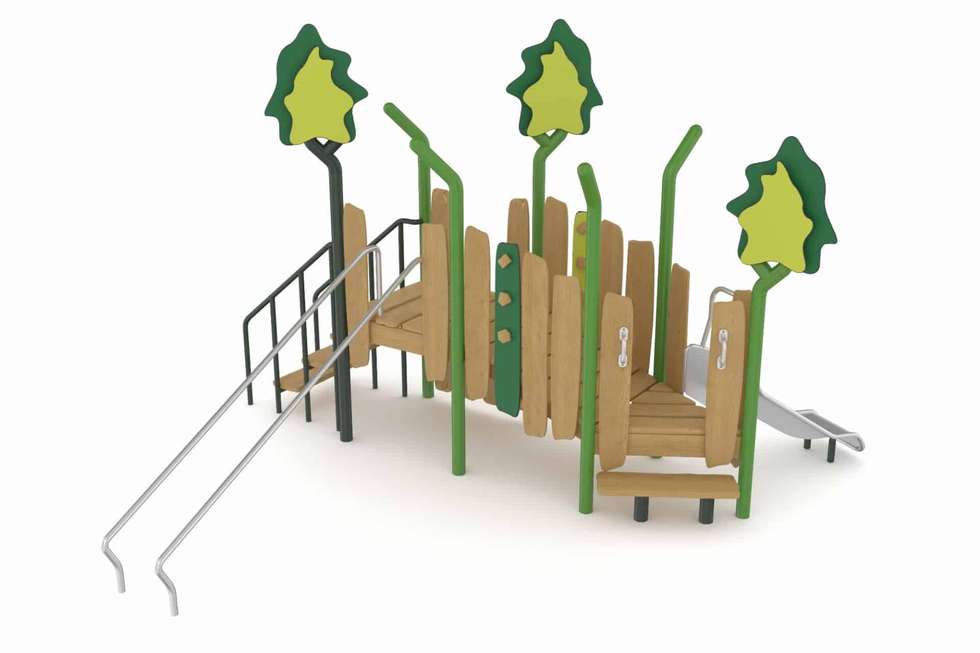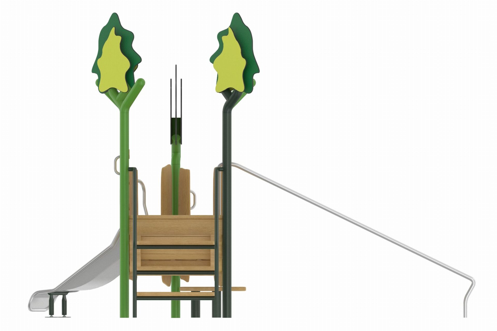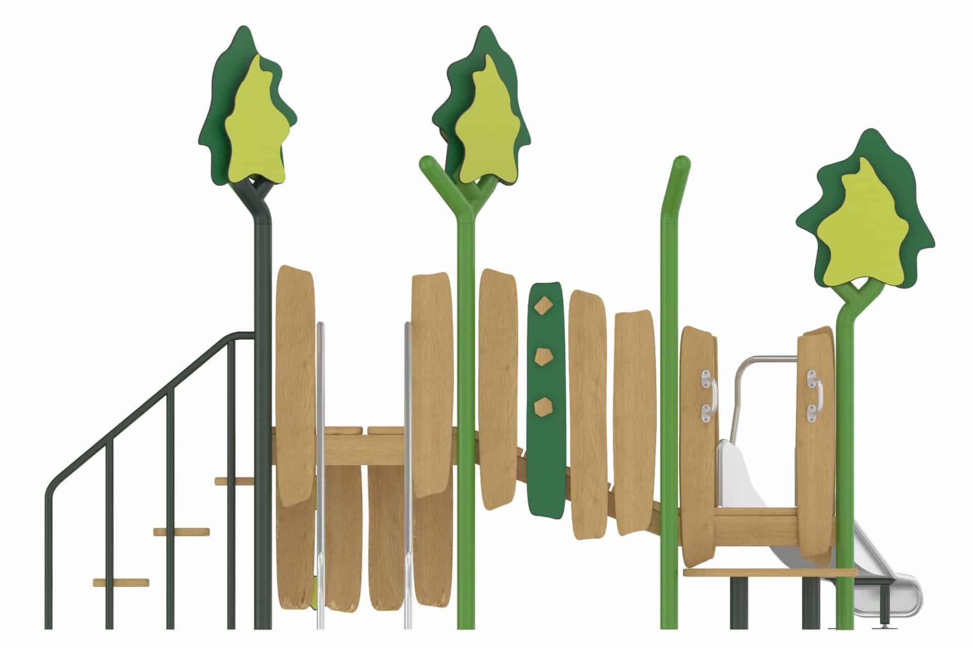 De Evergreen-serie speeltoestellen combineert eigentijdse materialen met een natuurlijke uitstraling. Het duurzame, robuuste frame van gepoedercoate stalen staanders in een organische vorm staat garant voor een lange levensduur. Robinia houten panelen en zorgvuldig gekozen natuurtinten geven de torens een warme en uitnodigende uitstraling die perfect past in elke omgeving.
