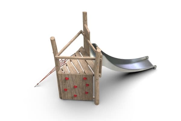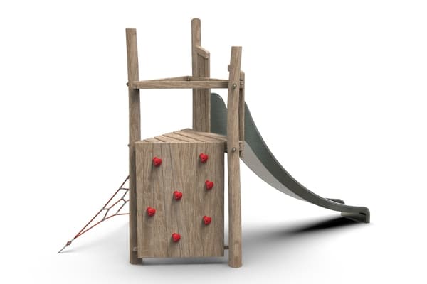 Glijtoren van 1,50 meter hoog met klimnet en klimwand.