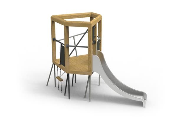 Abstracte glijtoren met verschillende klimopgangen en een glijbaanhoogte van 1.50 meter.