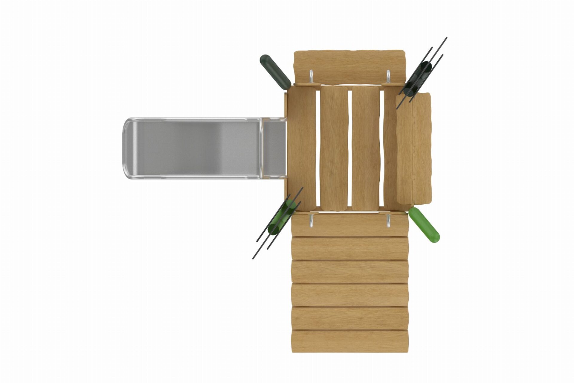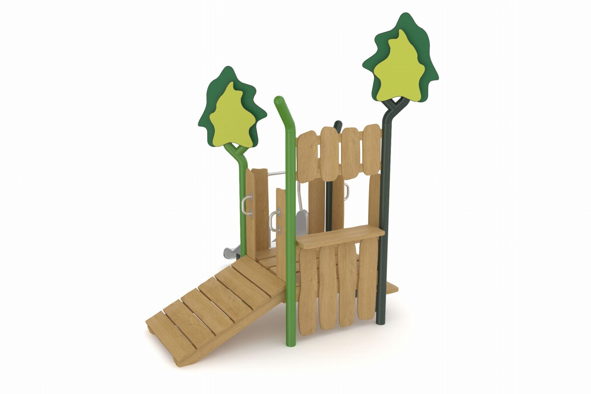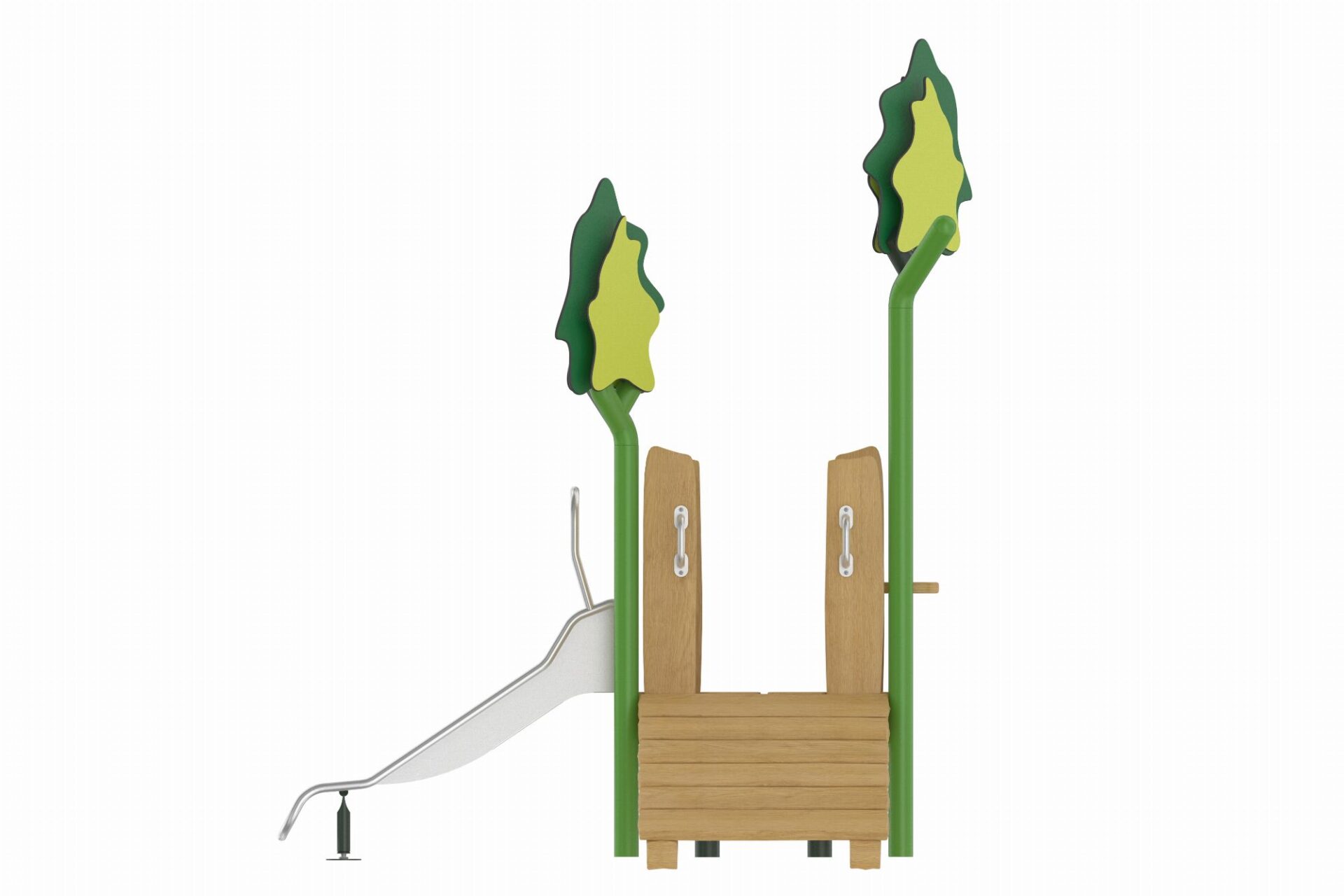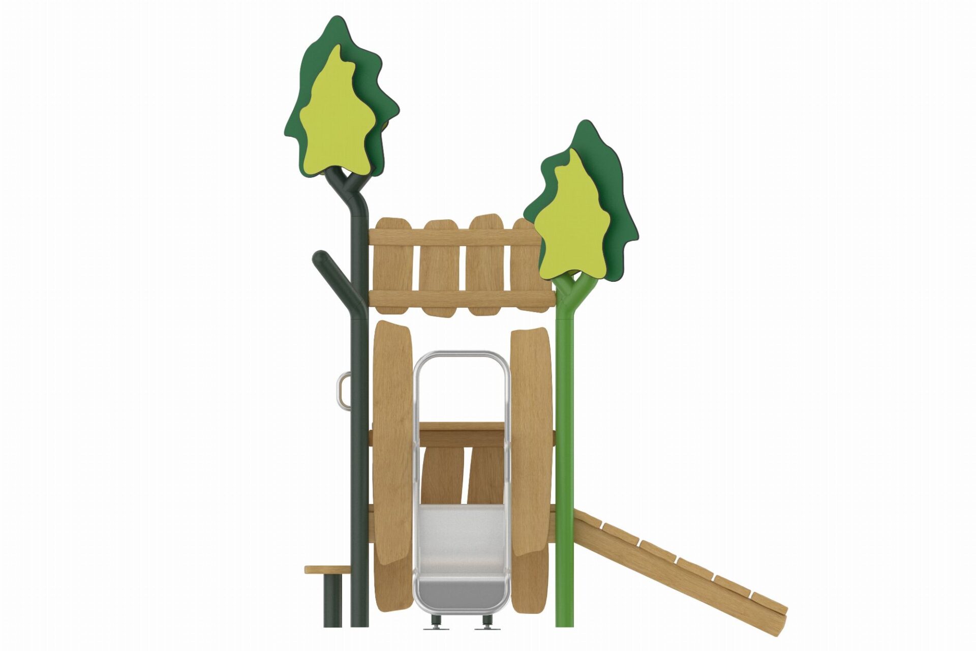 De Evergreen-serie speeltoestellen combineert eigentijdse materialen met een natuurlijke uitstraling. Het duurzame, robuuste frame van gepoedercoate stalen staanders in een organische vorm staat garant voor een lange levensduur. Robinia houten panelen en zorgvuldig gekozen natuurtinten geven de torens een warme en uitnodigende uitstraling die perfect past in elke omgeving.