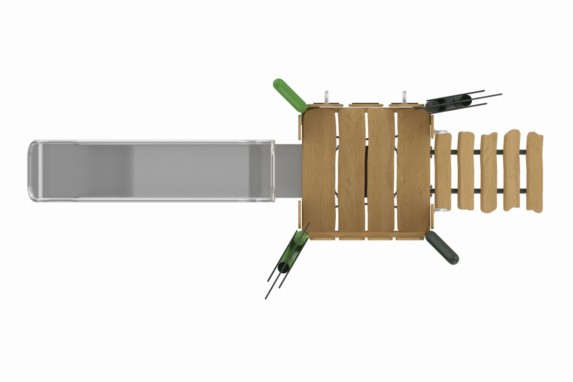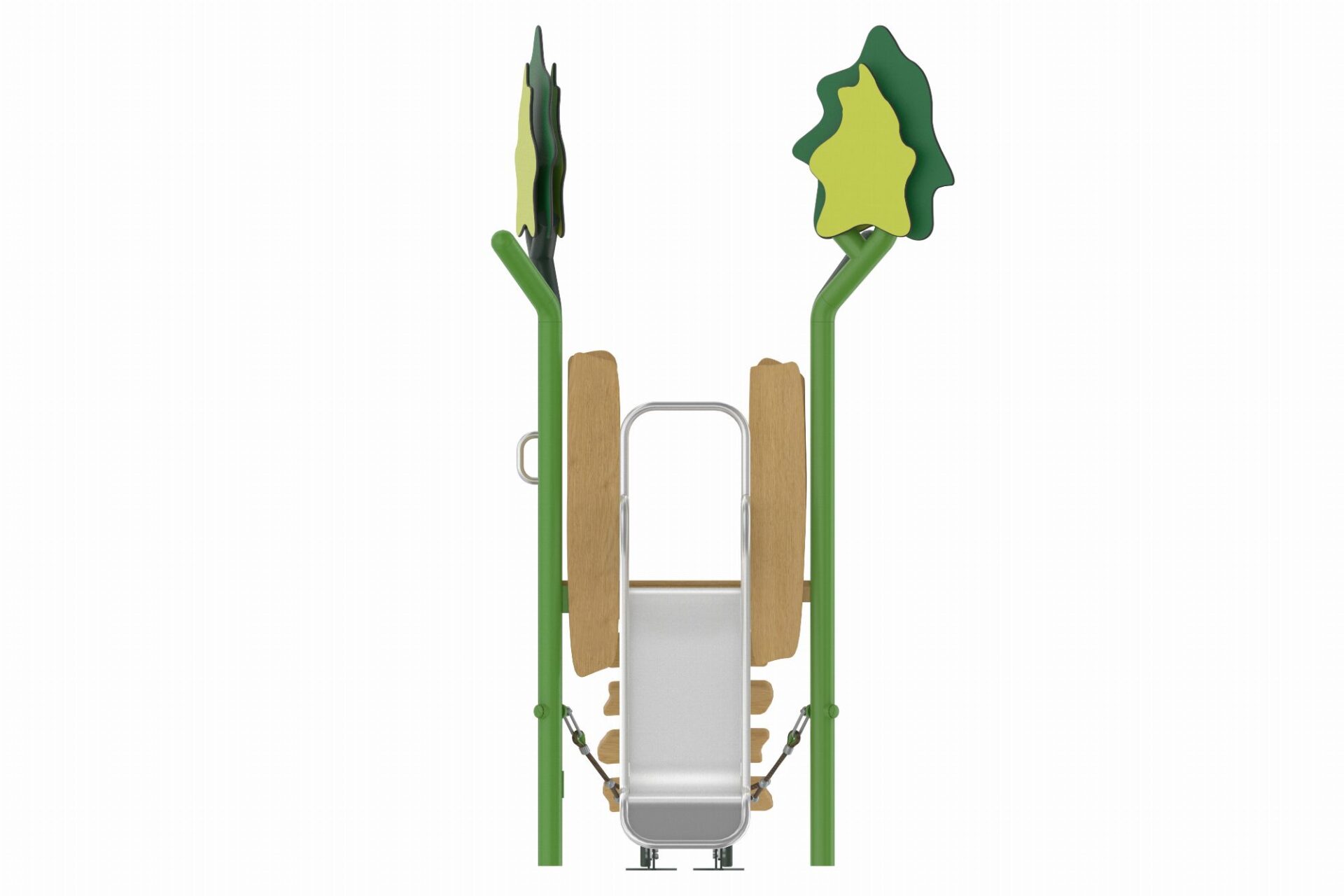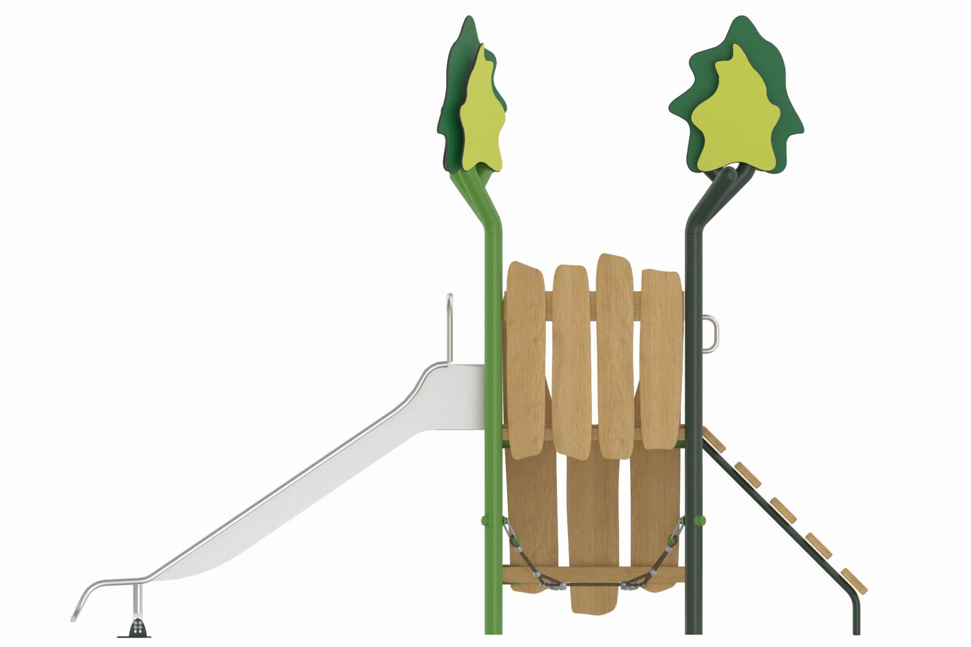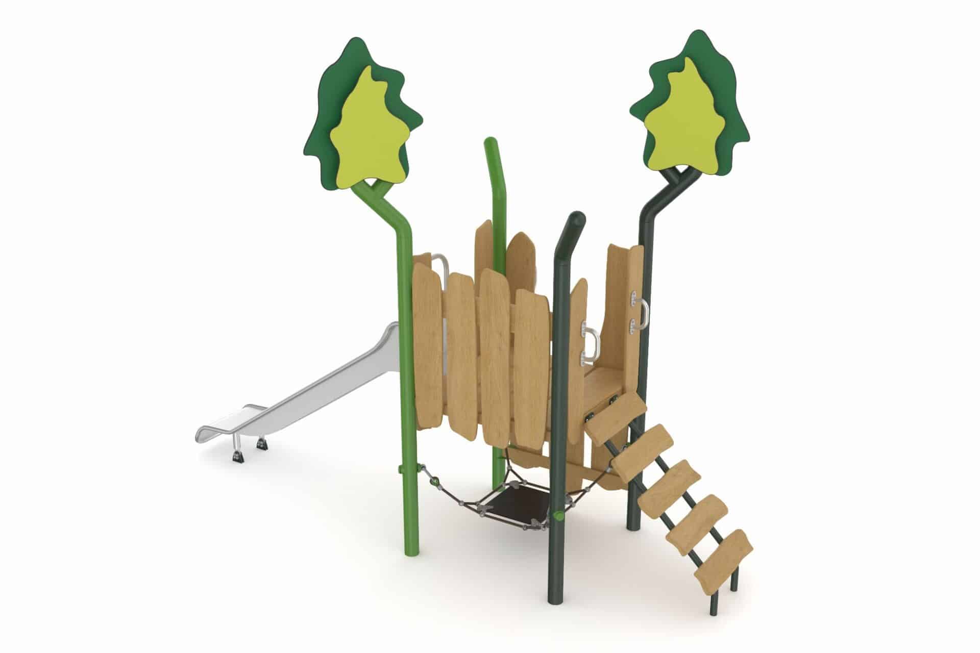 De Evergreen-serie speeltoestellen combineert eigentijdse materialen met een natuurlijke uitstraling. Het duurzame, robuuste frame van gepoedercoate stalen staanders in een organische vorm staat garant voor een lange levensduur. Robinia houten panelen en zorgvuldig gekozen natuurtinten geven de torens een warme en uitnodigende uitstraling die perfect past in elke omgeving.