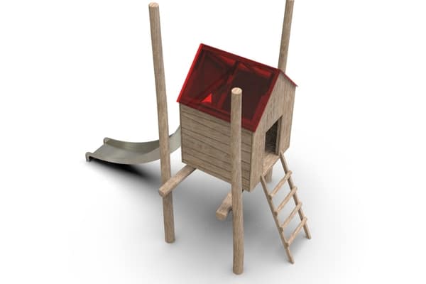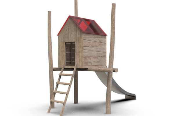 Hoog speelhuis op palen met trap, rvs glijbaan en rood plexiglas dak.