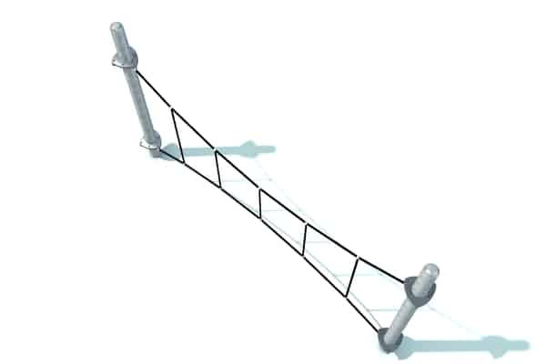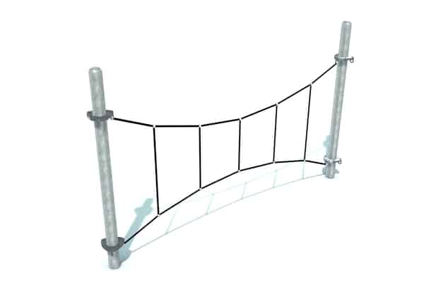 Horzizontaal en uitdagend klimelement met geometrische netstructuren. Door de beperkte valhoogte is plaatsing op een natuurlijke bodem mogelijk. Hoogwaardige kabels zijn met gegalvaniseerde staanders gecombineerd.