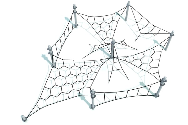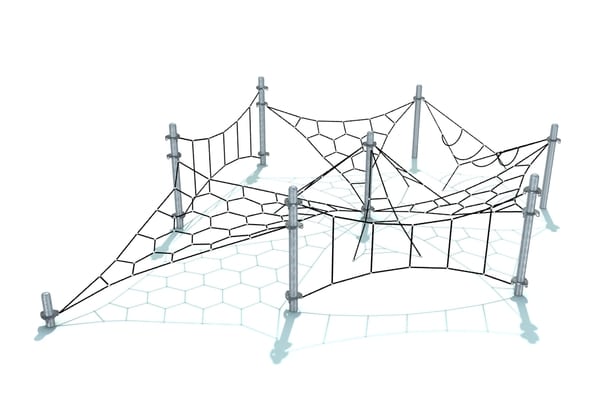 Horzizontaal en uitdagend klimelement met geometrische netstructuren. Door de beperkte valhoogte is plaatsing op een natuurlijke bodem mogelijk. Hoogwaardige kabels zijn met gegalvaniseerde staanders gecombineerd.