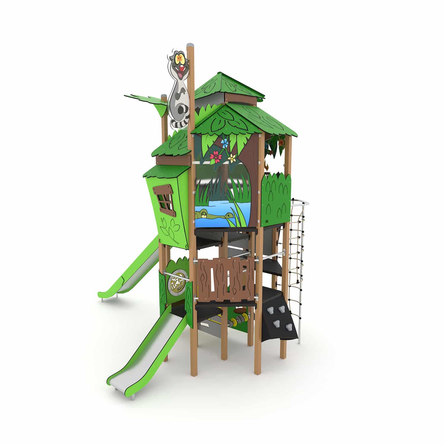 De Jungle serie bestaat uit een indrukwekkende serie speelcombinaties in Junglethema. Door de thematisch vormgegeven speeltoestellen kan rollenspel tot ware kunst verheven worden. Daarnaast raak je niet uitgespeeld door de vele manipulatieve elementen die in de producten verwerkt zijn. Binnen de serie is er niet bespaard op kwaliteit. Hoogwaardige RVS staanders vormen de stabiele basis, plaatwerk is vervaardigd uit hoogwaardig HDPE en HPL kunststof en bruggen en klimnetten zijn van staalversterkt touwwerk. Met torens tot wel 9.00 meter hoog kan er op verschillende niveaus worden gespeeld en zijn de RVS buisglijbanen een regelrechte hit!