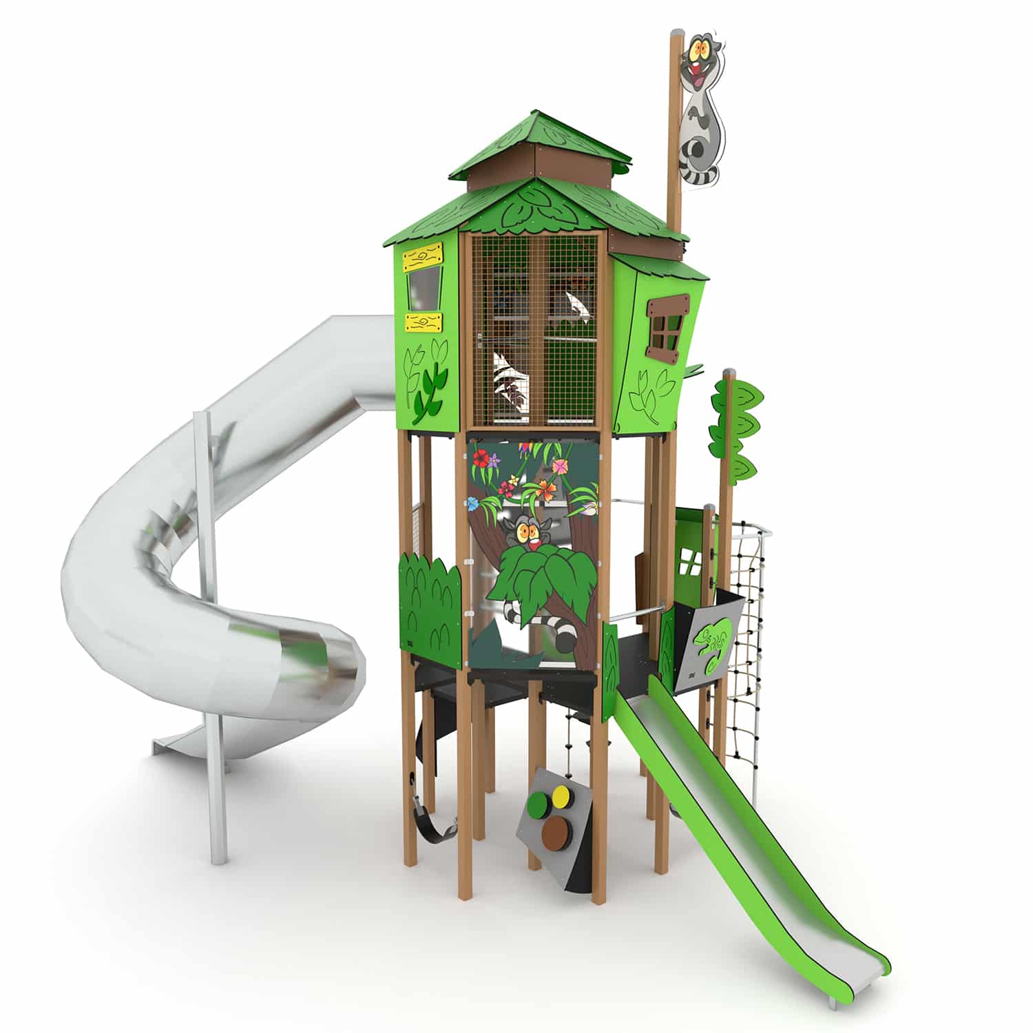 De Jungle serie bestaat uit een indrukwekkende serie speelcombinaties in Junglethema. Door de thematisch vormgegeven speeltoestellen kan rollenspel tot ware kunst verheven worden. Daarnaast raak je niet uitgespeeld door de vele manipulatieve elementen die in de producten verwerkt zijn. Binnen de serie is er niet bespaard op kwaliteit. Hoogwaardige RVS staanders vormen de stabiele basis, plaatwerk is vervaardigd uit hoogwaardig HDPE en HPL kunststof en bruggen en klimnetten zijn van staalversterkt touwwerk. Met torens tot wel 9.00 meter hoog kan er op verschillende niveaus worden gespeeld en zijn de RVS buisglijbanen een regelrechte hit!