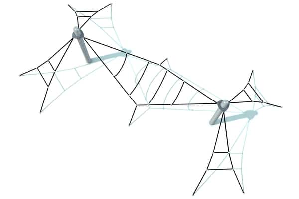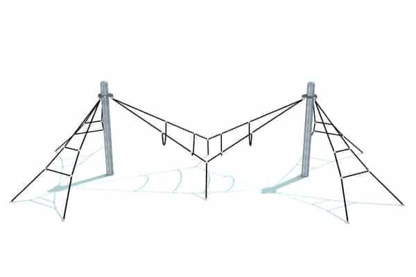 Horzizontaal en uitdagend klimelement met geometrische netstructuren. Door de beperkte valhoogte is plaatsing op een natuurlijke bodem mogelijk. Hoogwaardige kabels zijn met gegalvaniseerde staanders gecombineerd.