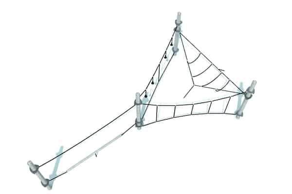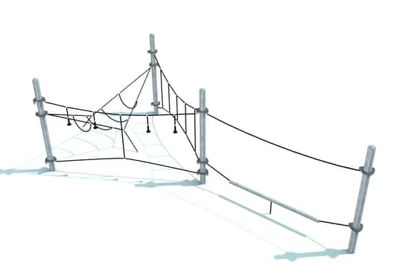 Horzizontaal en uitdagend klimelement met geometrische netstructuren. Door de beperkte valhoogte is plaatsing op een natuurlijke bodem mogelijk. Hoogwaardige kabels zijn met gegalvaniseerde staanders gecombineerd.