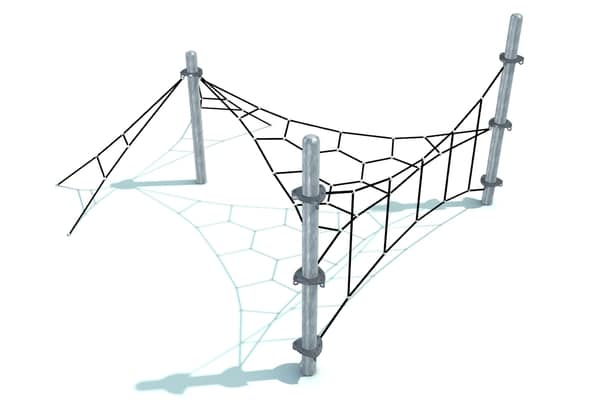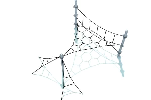 Horzizontaal en uitdagend klimelement met geometrische netstructuren. Door de beperkte valhoogte is plaatsing op een natuurlijke bodem mogelijk. Hoogwaardige kabels zijn met gegalvaniseerde staanders gecombineerd.