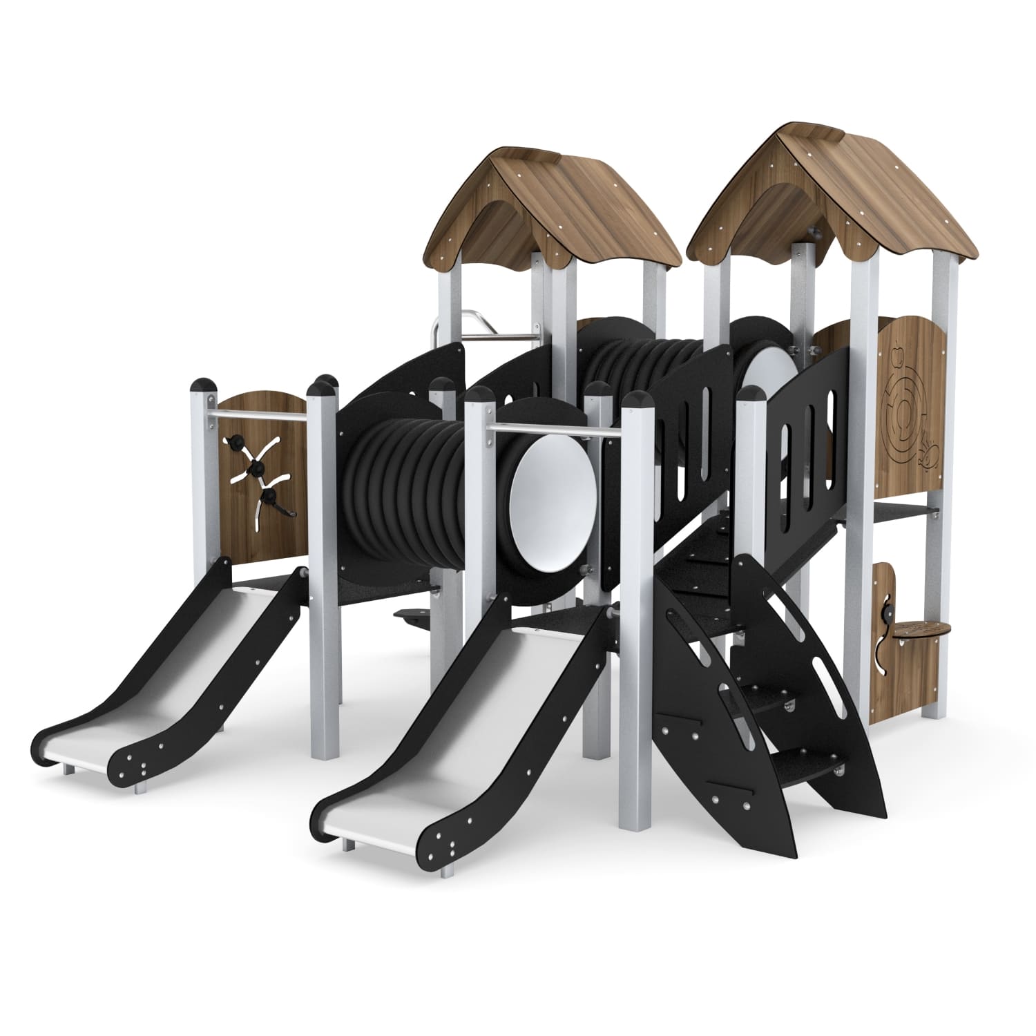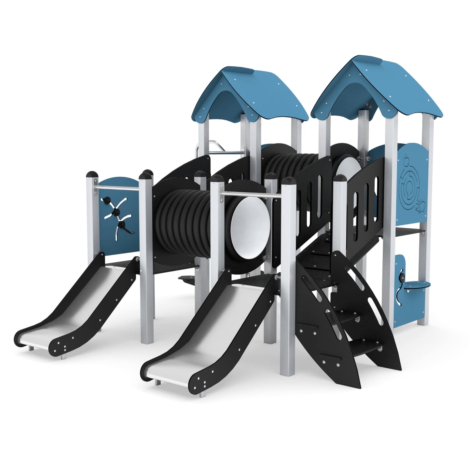 Speelcombinatie met 4 torens, 2 glijbanen, kruipbuizen en klim-/glijpaal