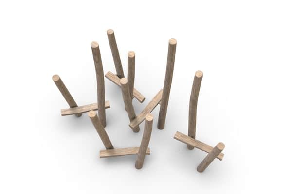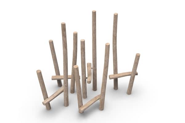 Palenwoud van horizontale en verticale balanceerpalen.