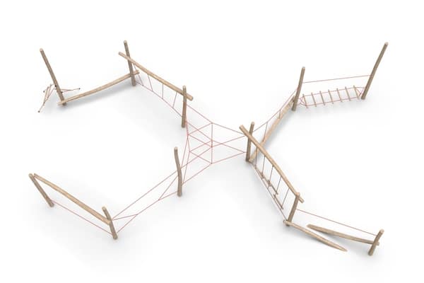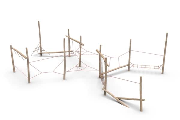 Langgerekt balanceerparcours met een lage valhoogte waardoor dit toestel op gras mag worden toegepast.