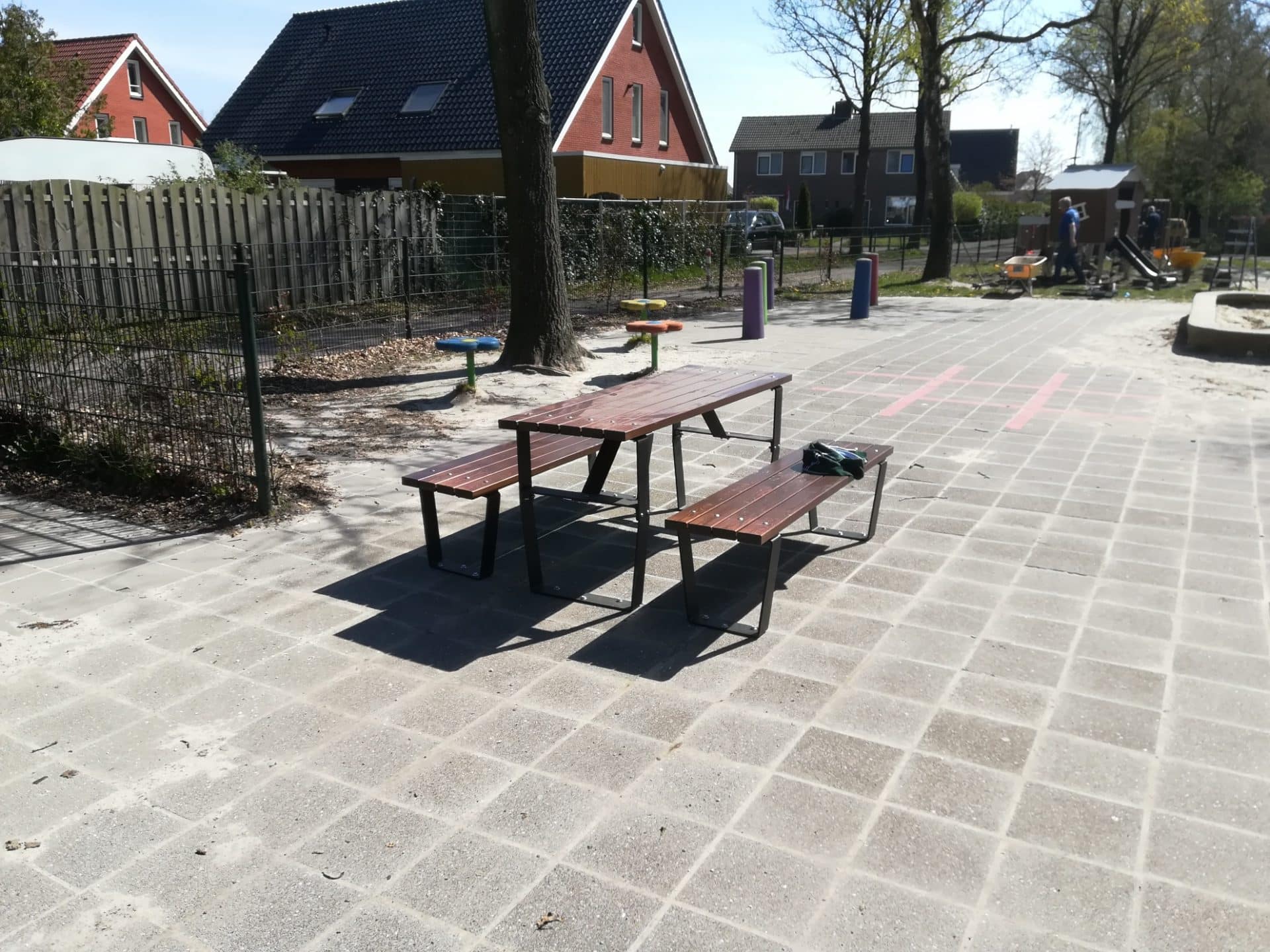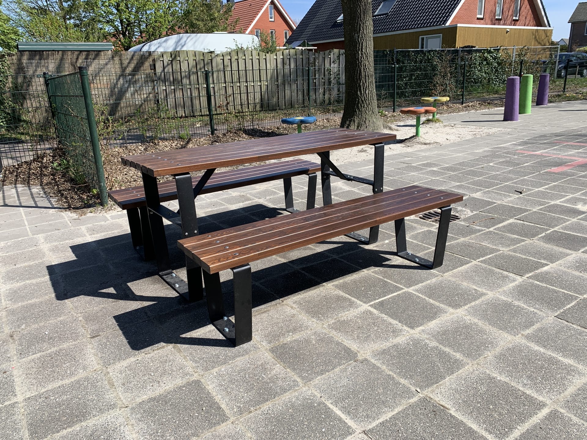 Deze duurzame picknickset is vervaardigd uit een metalen frame met houten zitting, leuning en tafelblad.