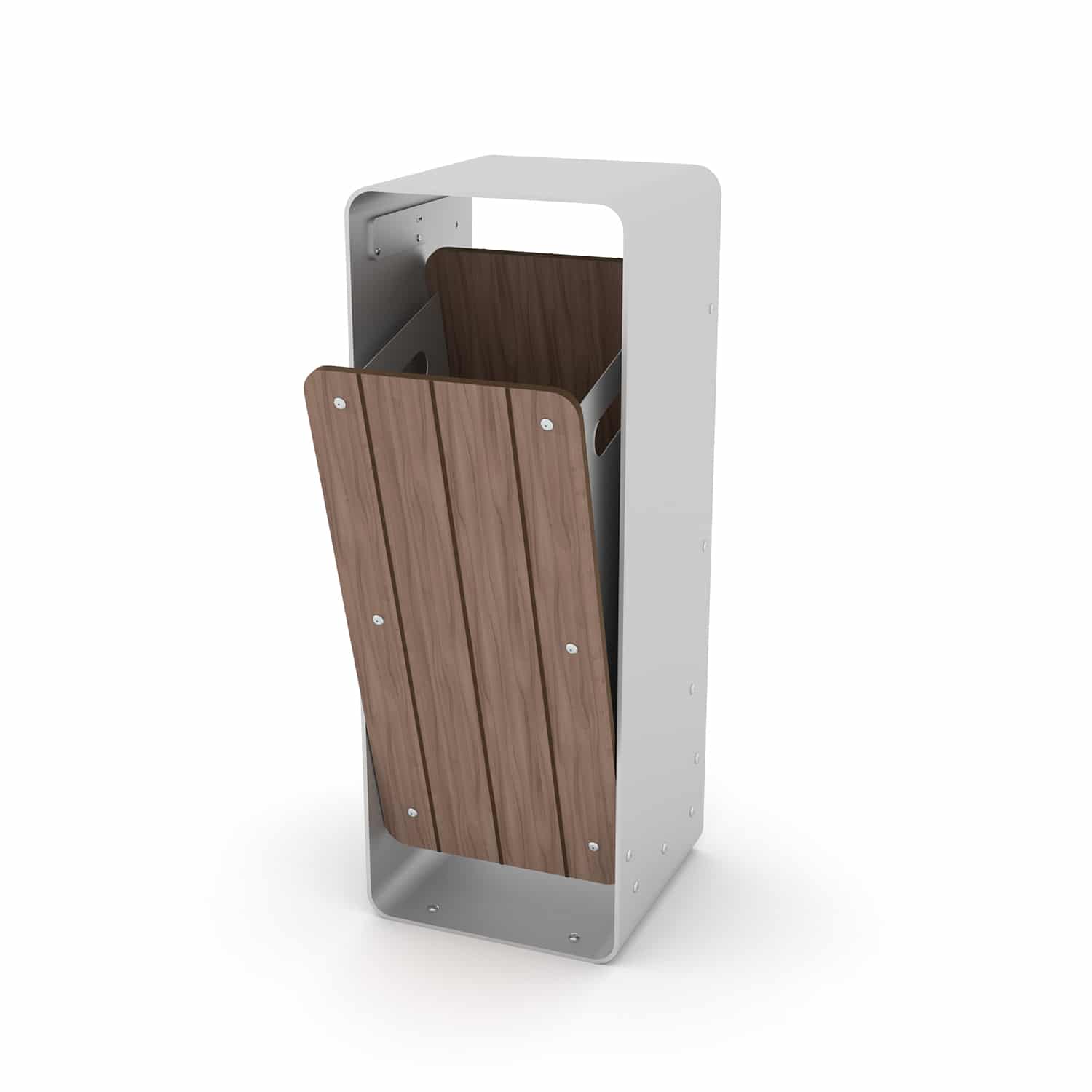 Strak vormgegeven afvalbak vervaardigd uit verzinkt en gepoedercoat staal met HPL front.