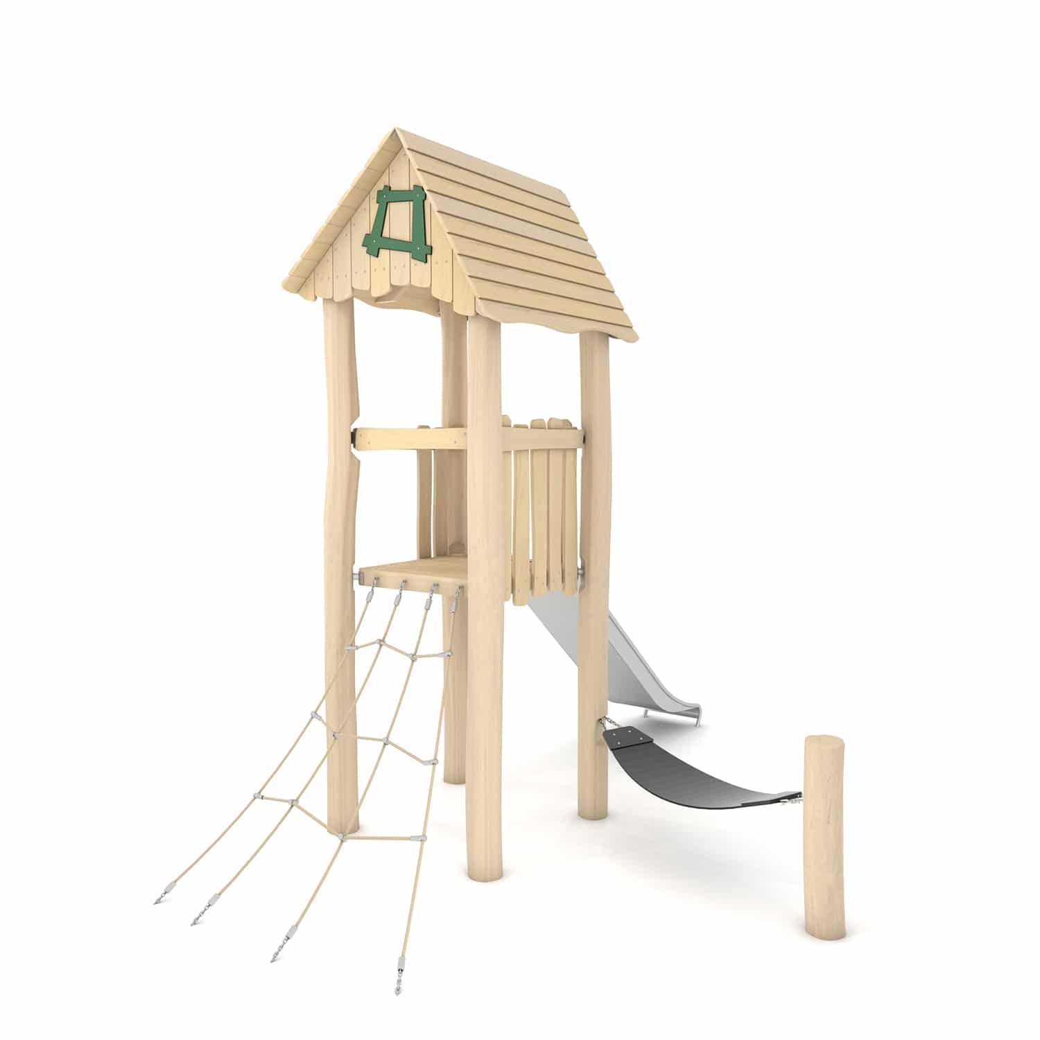 Glijtoren met glijbaan, brandweerpaal, hangmat en klimnet