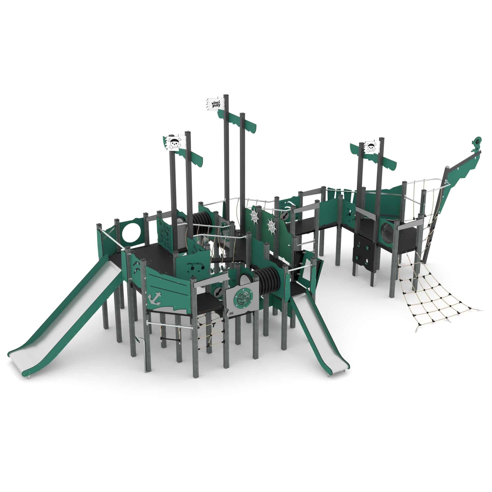 Dit enorme speelschip beschikt over meerdere glijbanen, klim- en klauterelementen. Het thematische aspect van een schip is nog immens populair wat ook terug te zien is in het rollenspel op de speelplek.
