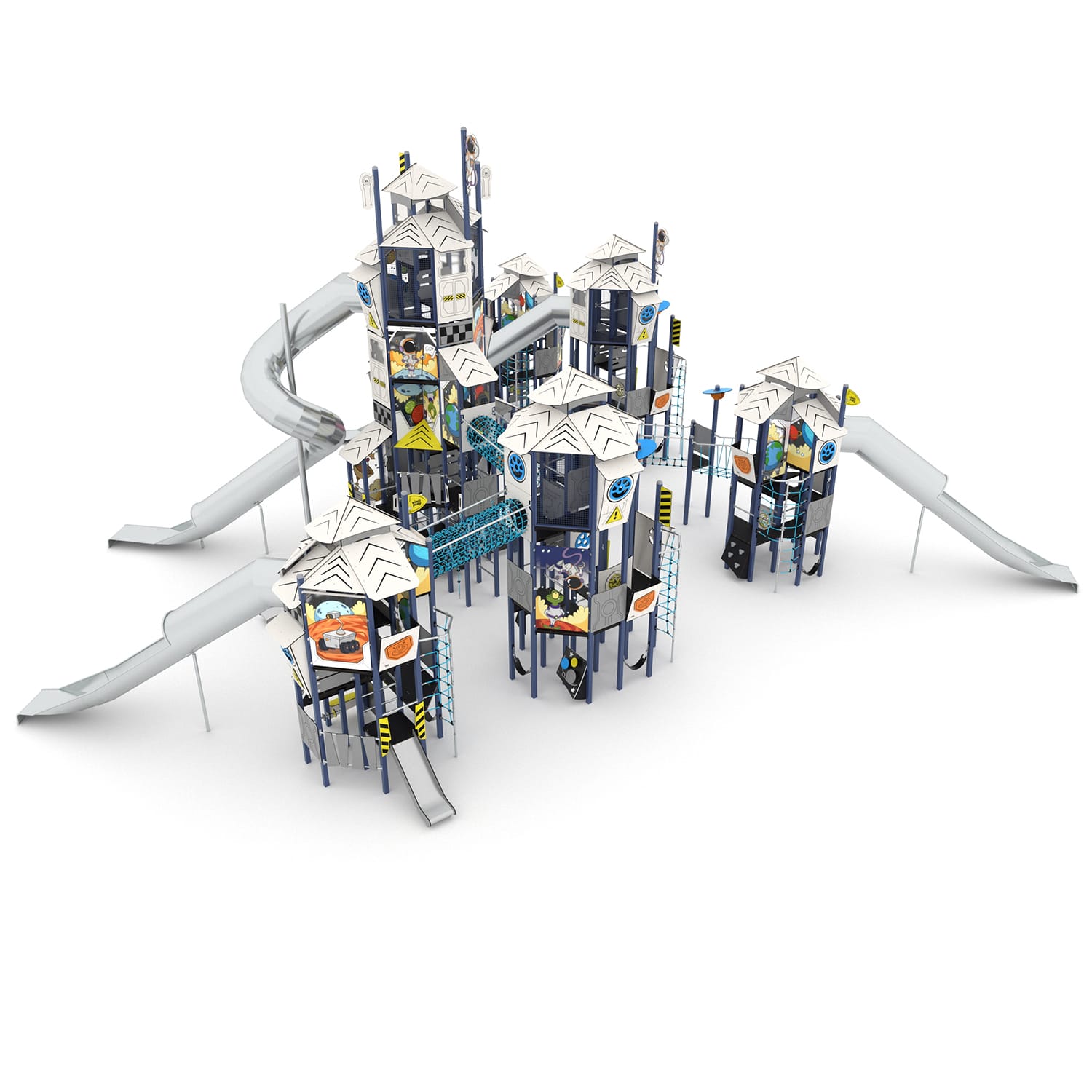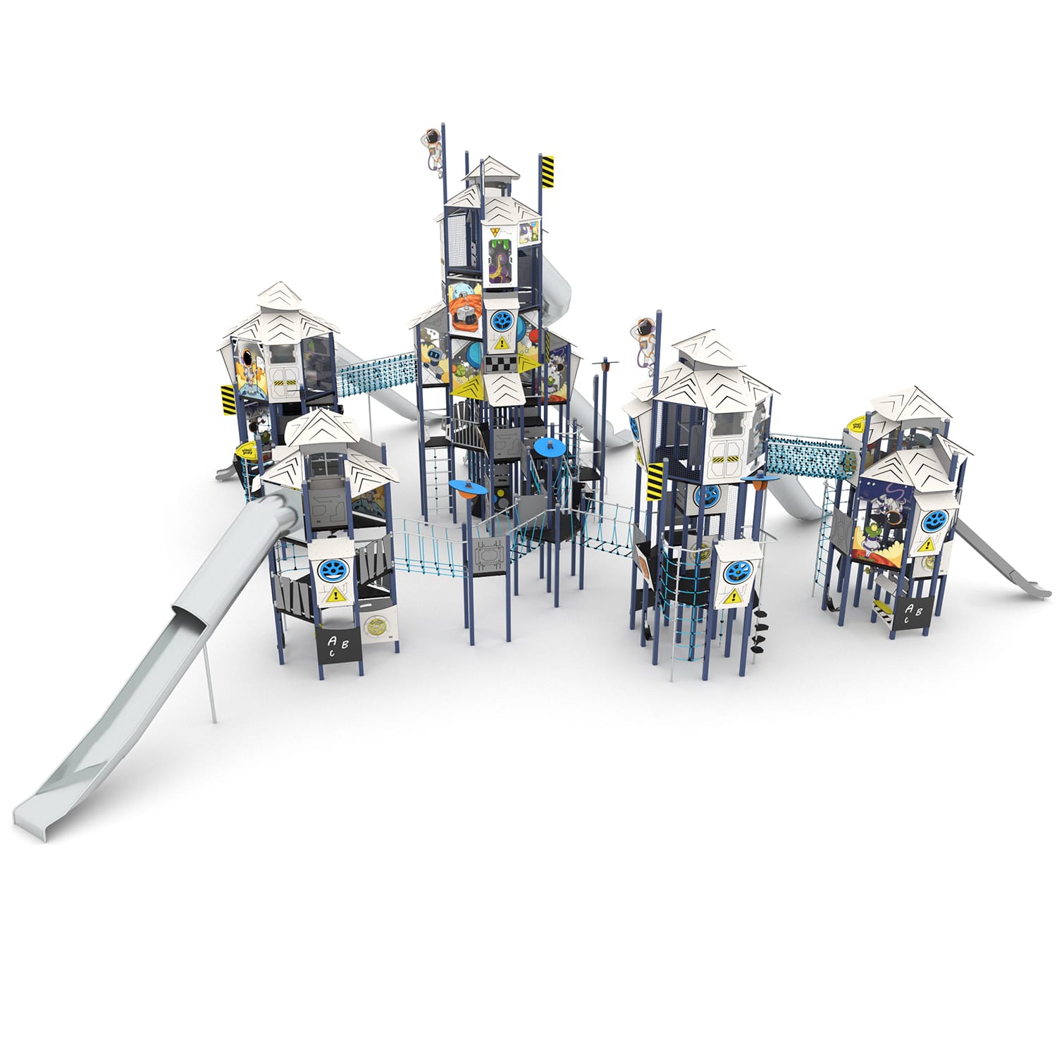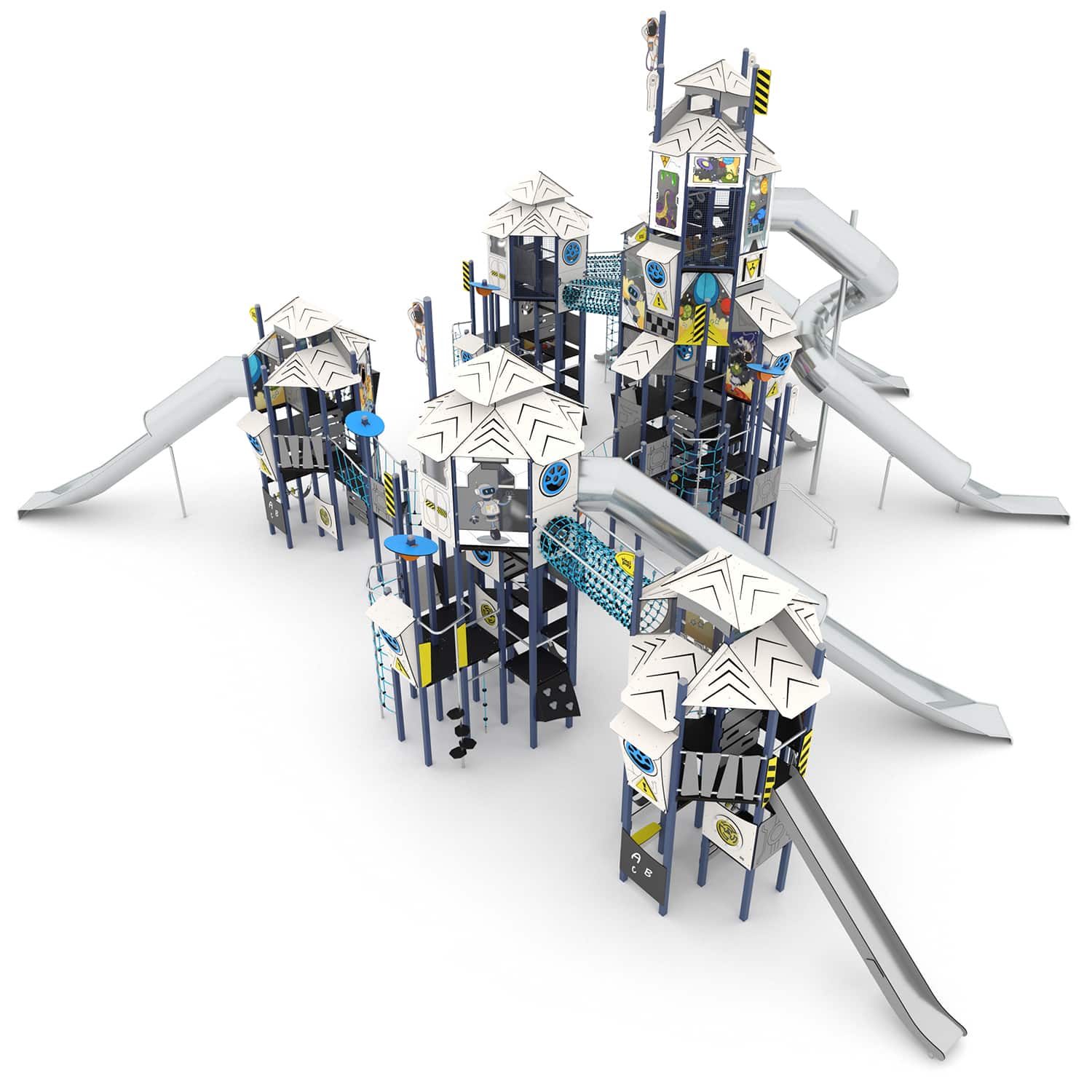 De Space serie bestaat uit een indrukwekkende serie speelcombinaties in ruimtethema. Door de thematisch vormgegeven speeltoestellen kan rollenspel tot ware kunst verheven worden. Daarnaast raak je niet uitgespeeld door de vele manipulatieve elementen die in de producten verwerkt zijn. Binnen de serie is er niet bespaard op kwaliteit. Hoogwaardige verzinkte stalen staanders met coating vormen de stabiele basis, plaatwerk is vervaardigd uit hoogwaardig HDPE en HPL kunststof en bruggen en klimnetten zijn van staalversterkt touwwerk. Met torens tot wel 9.00 meter hoog kan er op verschillende niveaus worden gespeeld en zijn de RVS buisglijbanen een regelrechte hit!