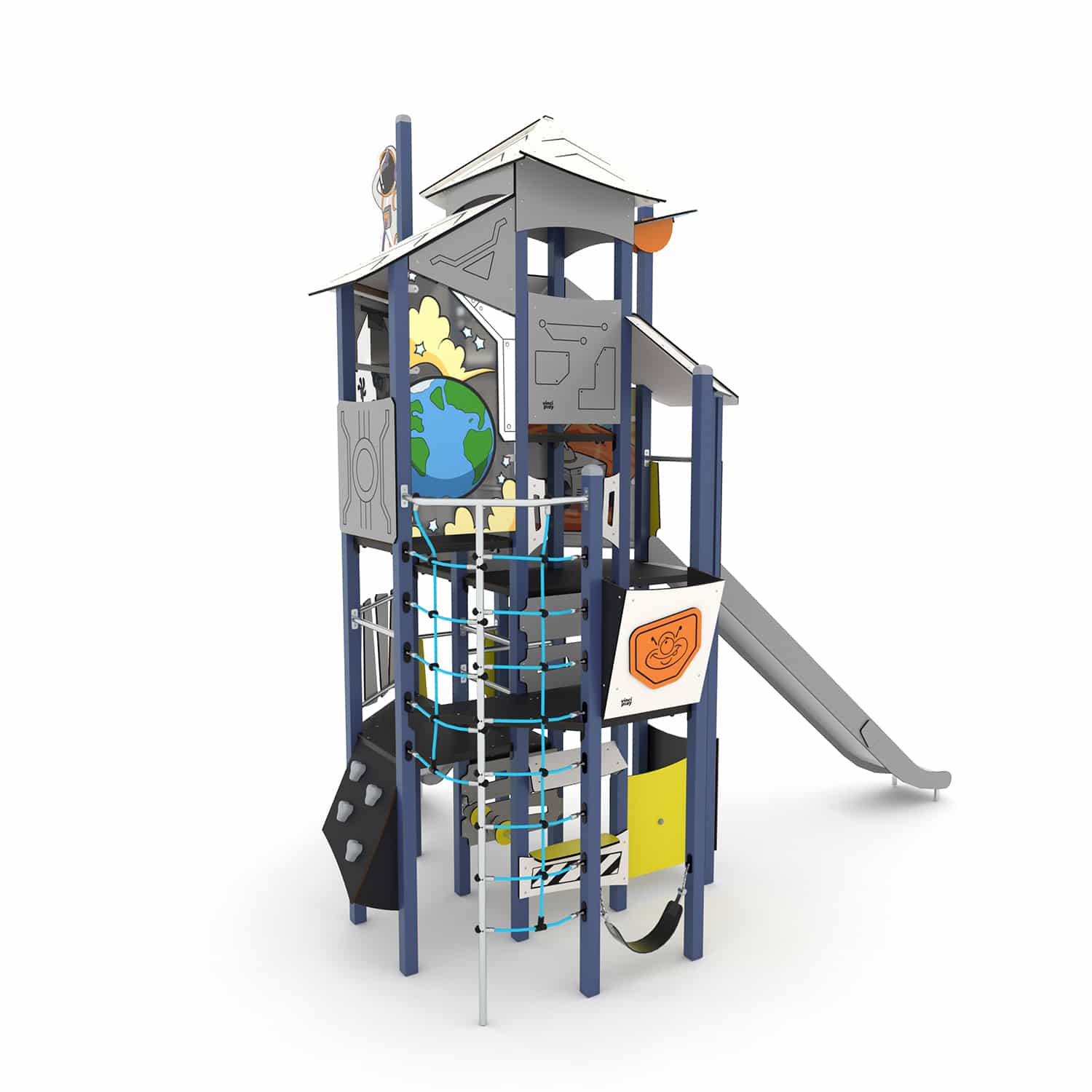 De Space serie bestaat uit een indrukwekkende serie speelcombinaties in ruimtethema. Door de thematisch vormgegeven speeltoestellen kan rollenspel tot ware kunst verheven worden. Daarnaast raak je niet uitgespeeld door de vele manipulatieve elementen die in de producten verwerkt zijn. Binnen de serie is er niet bespaard op kwaliteit. Hoogwaardige verzinkte stalen staanders met coating vormen de stabiele basis, plaatwerk is vervaardigd uit hoogwaardig HDPE en HPL kunststof en bruggen en klimnetten zijn van staalversterkt touwwerk. Met torens tot wel 9.00 meter hoog kan er op verschillende niveaus worden gespeeld en zijn de RVS buisglijbanen een regelrechte hit!