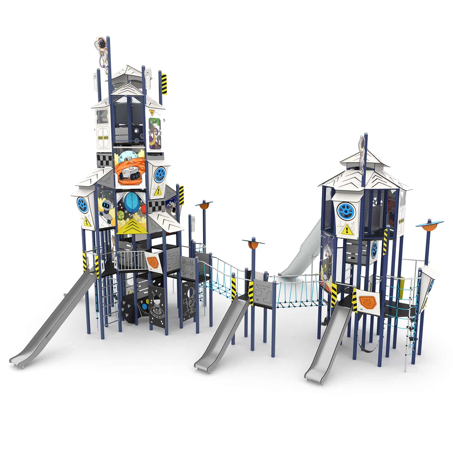 De Space serie bestaat uit een indrukwekkende serie speelcombinaties in ruimtethema. Door de thematisch vormgegeven speeltoestellen kan rollenspel tot ware kunst verheven worden. Daarnaast raak je niet uitgespeeld door de vele manipulatieve elementen die in de producten verwerkt zijn. Binnen de serie is er niet bespaard op kwaliteit. Hoogwaardige verzinkte stalen staanders met coating vormen de stabiele basis, plaatwerk is vervaardigd uit hoogwaardig HDPE en HPL kunststof en bruggen en klimnetten zijn van staalversterkt touwwerk. Met torens tot wel 9.00 meter hoog kan er op verschillende niveaus worden gespeeld en zijn de RVS buisglijbanen een regelrechte hit!