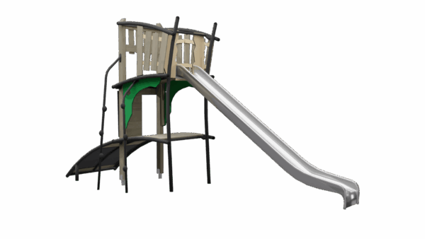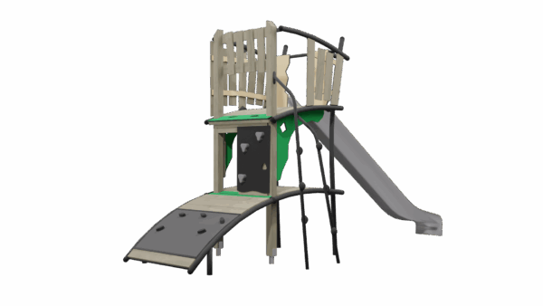 Dit moderne speeltoestel combineert klimmen, klauteren en glijden in één compacte en dynamische constructie. Het toestel bestaat uit een verhoogd platform, veilig omsloten met houten panelen, dat kinderen een gevoel van hoogte en avontuur geeft. Vanaf het platform glijden ze soepel naar beneden via een stevige RVS-glijbaan, die garant staat voor snelheid én duurzaamheid.