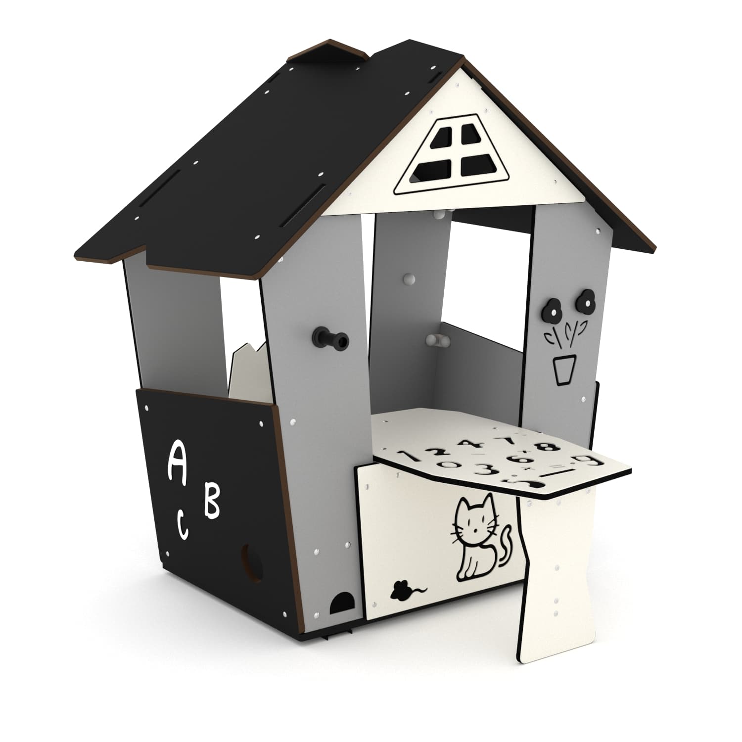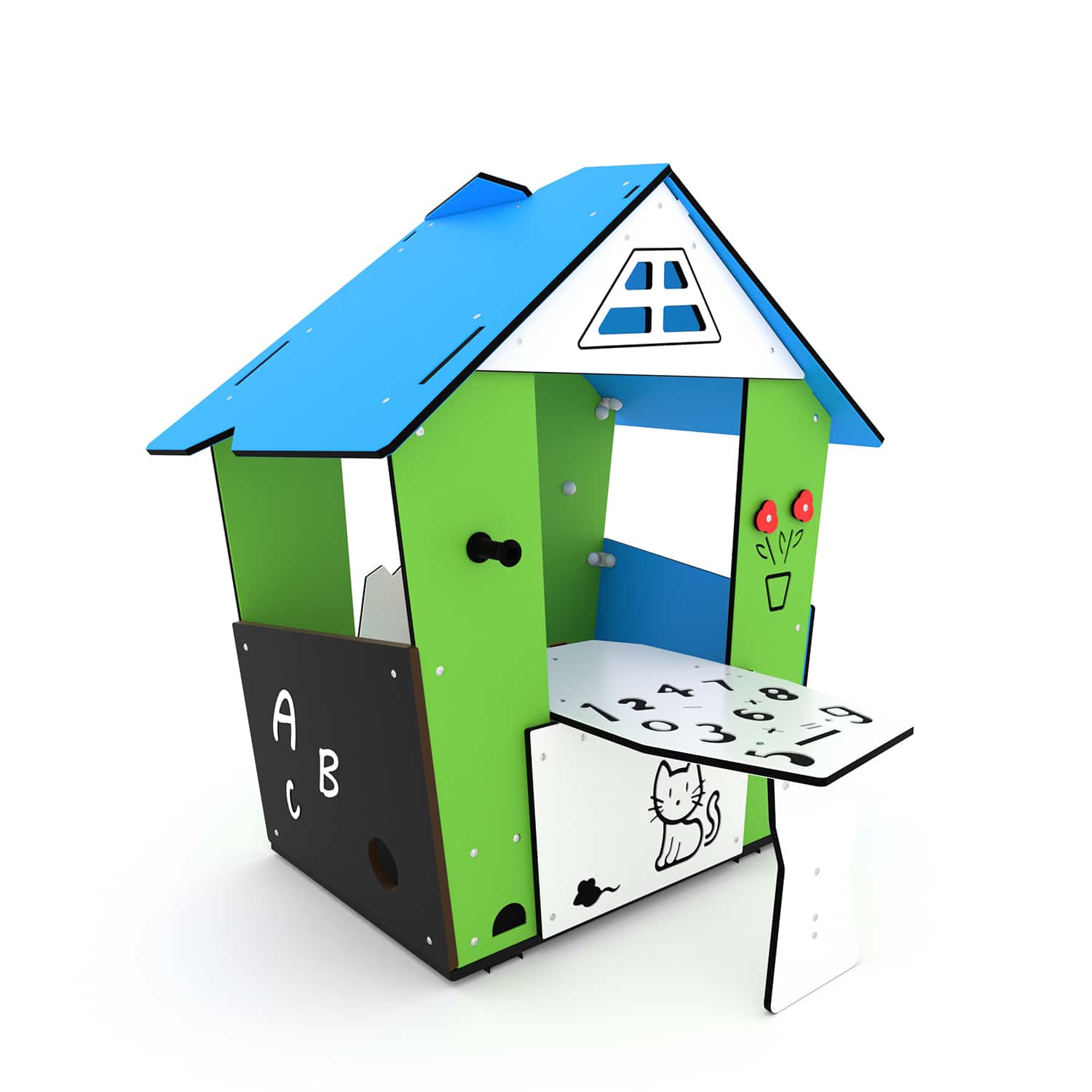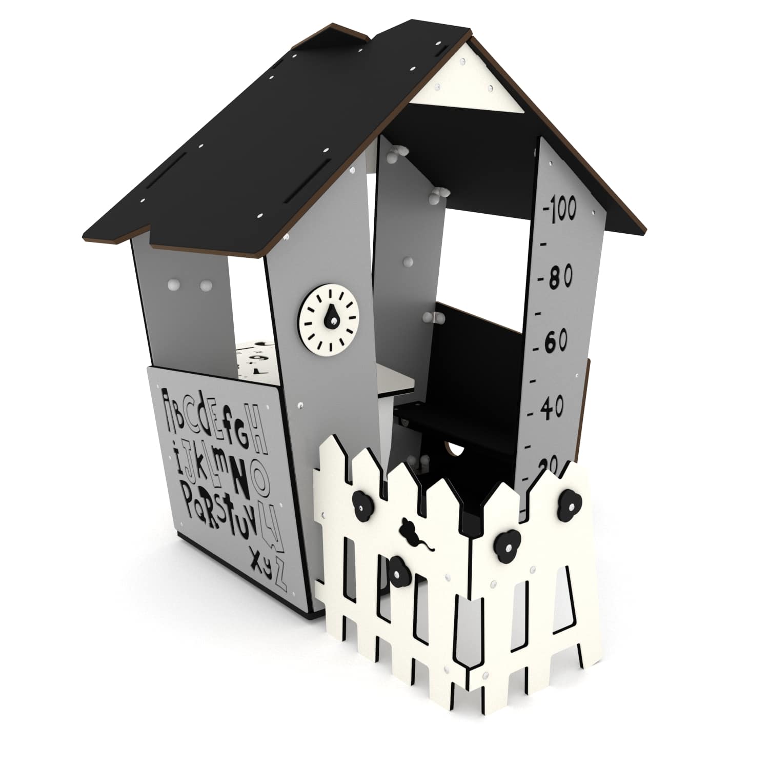 Prachtig vormgegeven educatief speelhuis.  Met het alfabet, een meetlat, krijtbord, tafel en bank.  Leuk versierd met div afbeeldingen.  Echt een speelhuis waar kinderen fantasie de vrije loop kunnen laten.