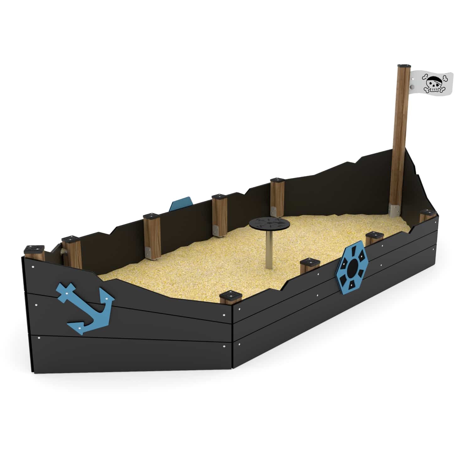 Deze zandbak spreekt tot de verbeelding! Een Zandschip uitgevoerd met tafel om de rantsoenen zoals een zandtaartje op voor te bereiden. Als vlag kan ook voor een andere afbeelding worden gekozen.