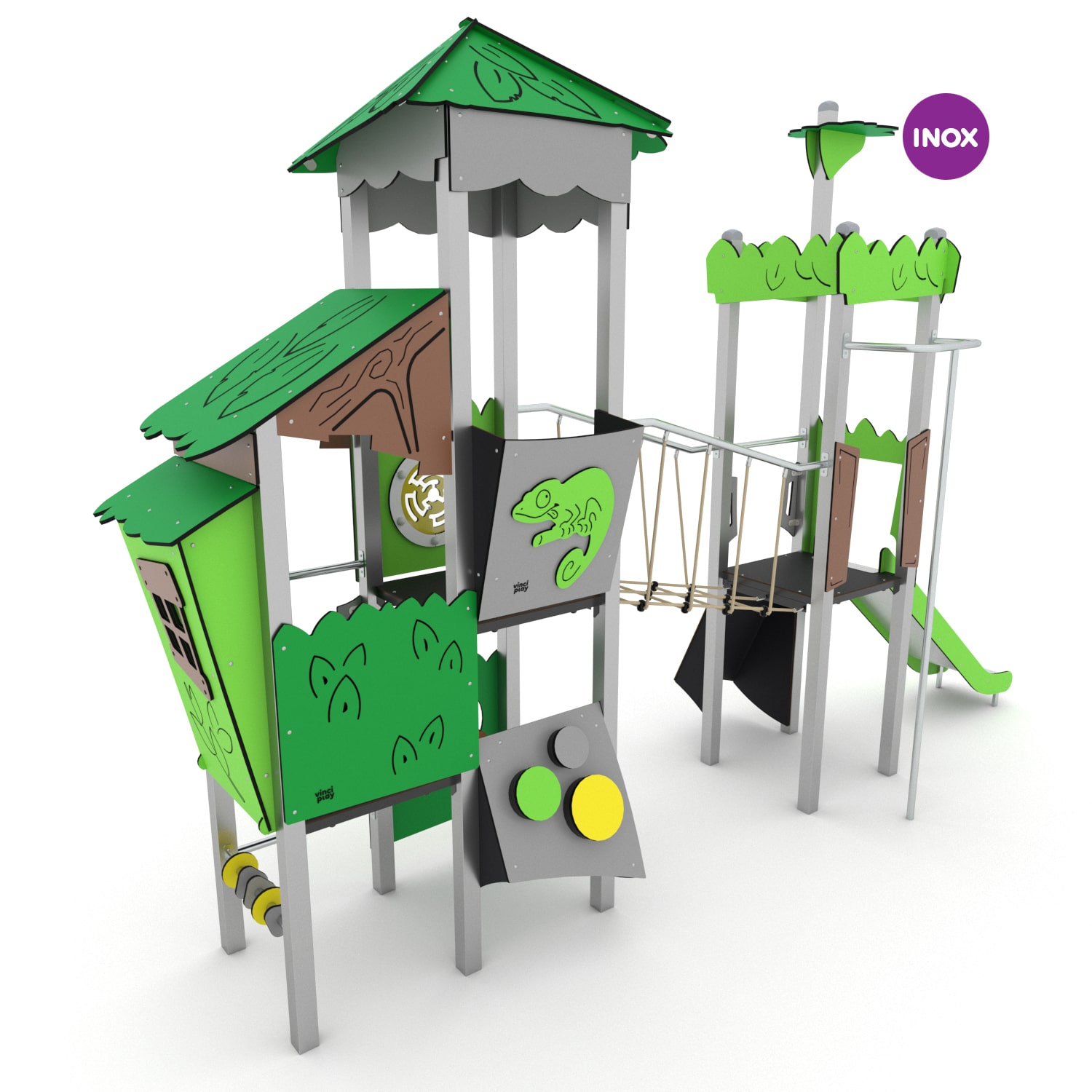 De Jungle serie bestaat uit een indrukwekkende serie speelcombinaties in Junglethema. Door de thematisch vormgegeven speeltoestellen kan rollenspel tot ware kunst verheven worden. Daarnaast raak je niet uitgespeeld door de vele manipulatieve elementen die in de producten verwerkt zijn. Binnen de serie is er niet bespaard op kwaliteit. Hoogwaardige verzinkte stalen staanders met coating vormen de stabiele basis, plaatwerk is vervaardigd uit hoogwaardig HDPE en HPL kunststof en bruggen en klimnetten zijn van staal versterkt touwwerk. Met torens tot wel 9.00 meter hoog kan er op verschillende niveaus worden gespeeld en zijn de RVS buisglijbanen een regelrechte hit!