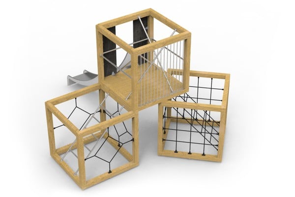 Abstracte kubuscombinatie met verschillende klimelementen en een rvs glijbaan.