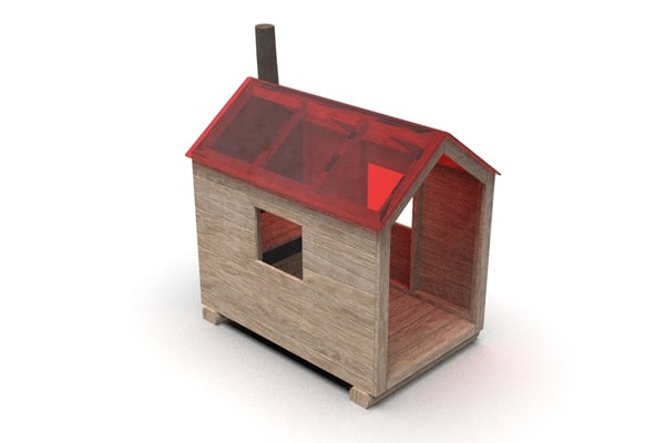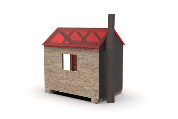 Speelhuis met vlonder, rood plexiglas dak en schoorsteen.