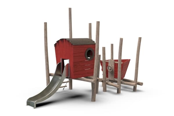 Speelschip op palen met kajuit, voorsteven, stuurwiel, balanceerbalken en rvs glijbaan.