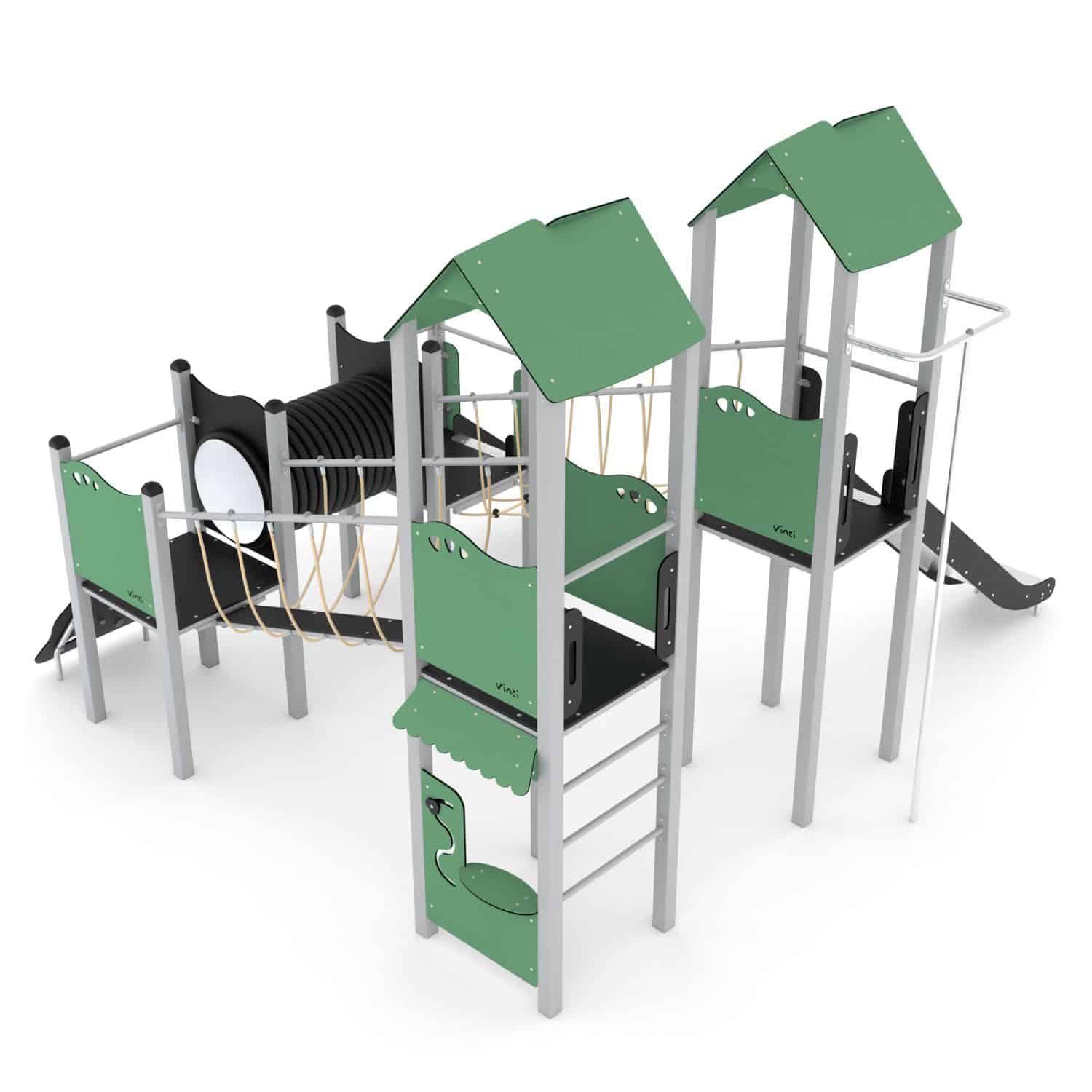 Speelcombinatie met 4 torens, 2 glijbanen, bruggen, kruipbuis en glijpaal